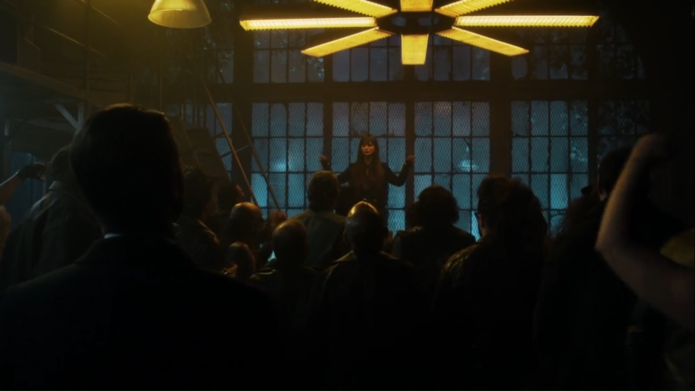 Over at Cherry’s, Nygma gets the crowd pumped for the Doc’s arrival. Jim arrives just as the Doc descends the stairs and is surprised to see that the Doc is, in fact, Leslie. The Doc tells the crowd that whoever tried to kill her apparently didn’t like what she said about the Narrows being united, because a united Narrows is a strong Narrows. And the assassin should be scared.