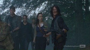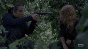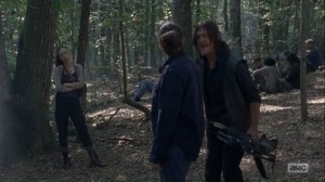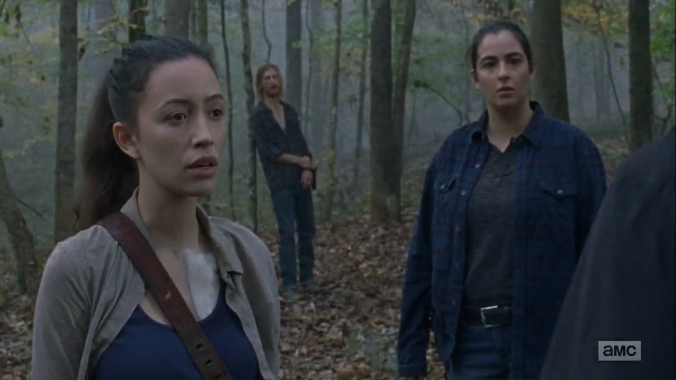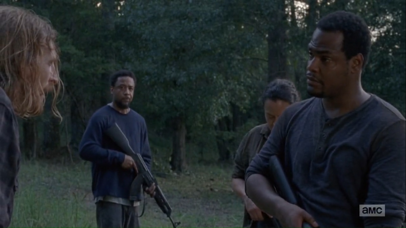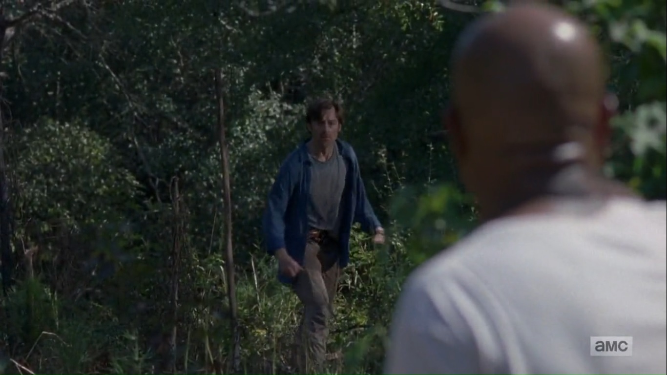 The two end up in a clearing, but they jump back into the bushes when they hear other Saviors passing nearby. Oh, so that’s the payoff to the opening.