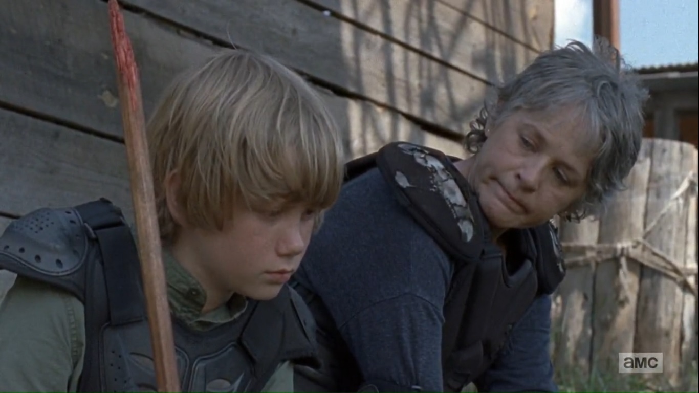 Maggie oversees the rebuilding of the Hilltop. Henry, meanwhile, hasn’t eaten in awhile, so Carol offers to take Morgan’s shift. Across from them, Jared asks the two to move Henry. That and he warns them that the Saviors will come, but Henry interrupts and asks which Savior is responsible for killing Benjamin. Okay, that’s enough, Henry. Carol and Morgan tell him to take a walk.
