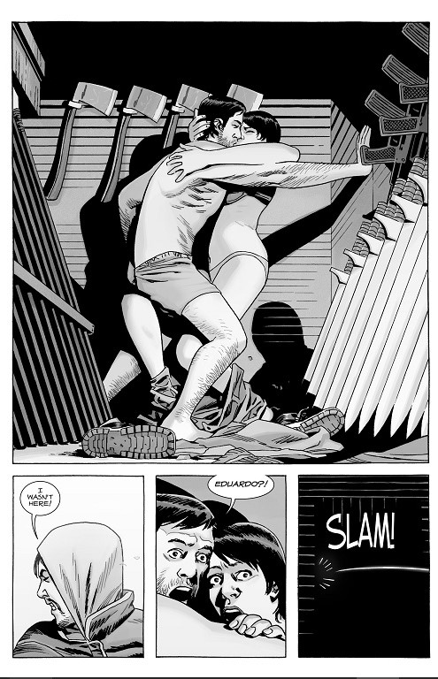 Over at the Hilltop, we get Eduardo catching Maggie in Dante in a…less than flattering position. Where are they? It looks like a sort of weapons shed, but with the weapons lined up the way they are, all around them, one wrong move could be…disastrous. Why here? It’s not a serious question- I find it all the more humorous and baffling that of all the places these two chose to bone, they picked this one.