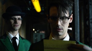 Over at Arkham, it turns out that Ed is signing up to volunteer. Riddler again brings up the riddle about what has two eyes, but can’t see, and yet Ed still can’t bring himself to answer it. But then in enters Oswald, who is overjoyed that Ed came.