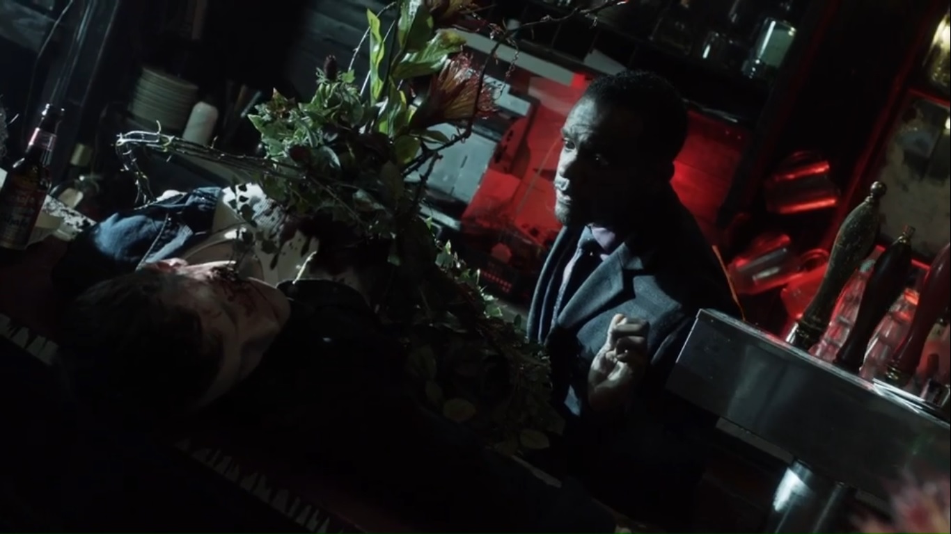 At a bar, Ivy shows up expecting to find Harvey Bullock, but he’s out sick. So instead, she decides to leave a message in the form of a plant. With their blood, they are the message. And with that, she blows the plant towards the bar patrons.