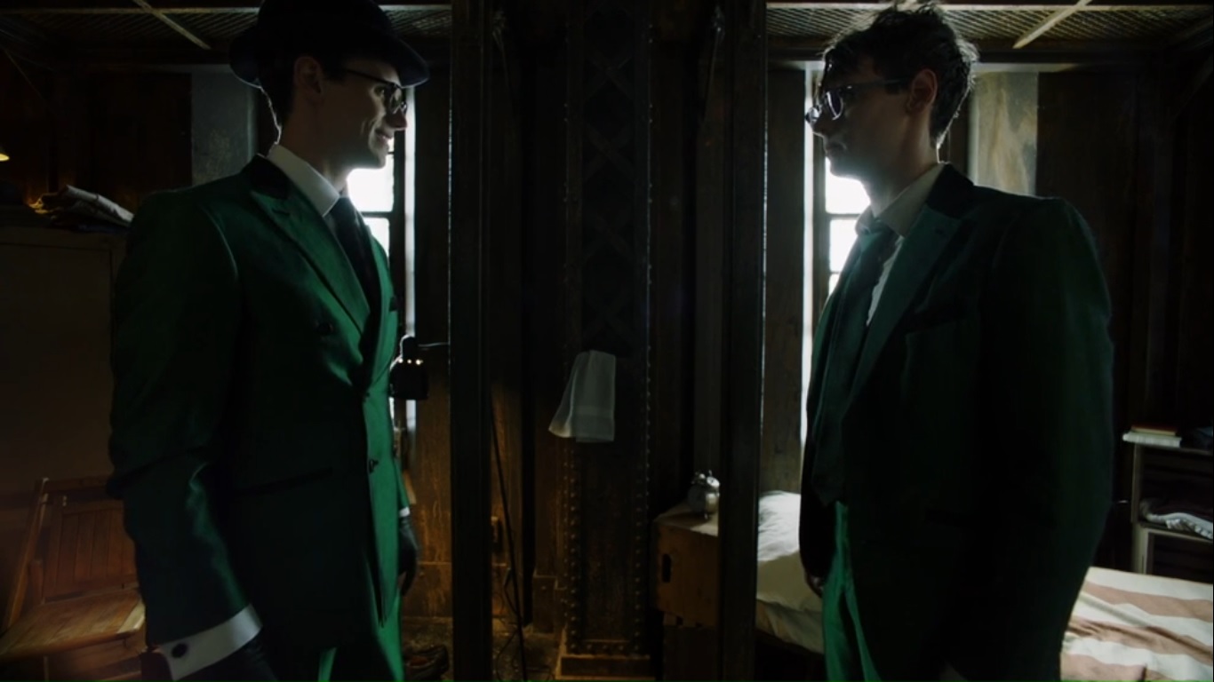 Over at Arkham, it turns out that Ed is signing up to volunteer. Riddler again brings up the riddle about what has two eyes, but can’t see, and yet Ed still can’t bring himself to answer it. But then in enters Oswald, who is overjoyed that Ed came.