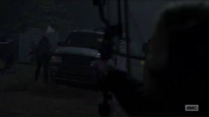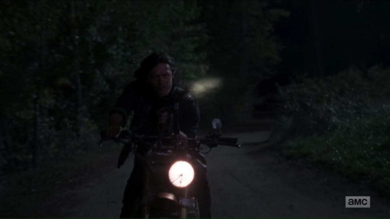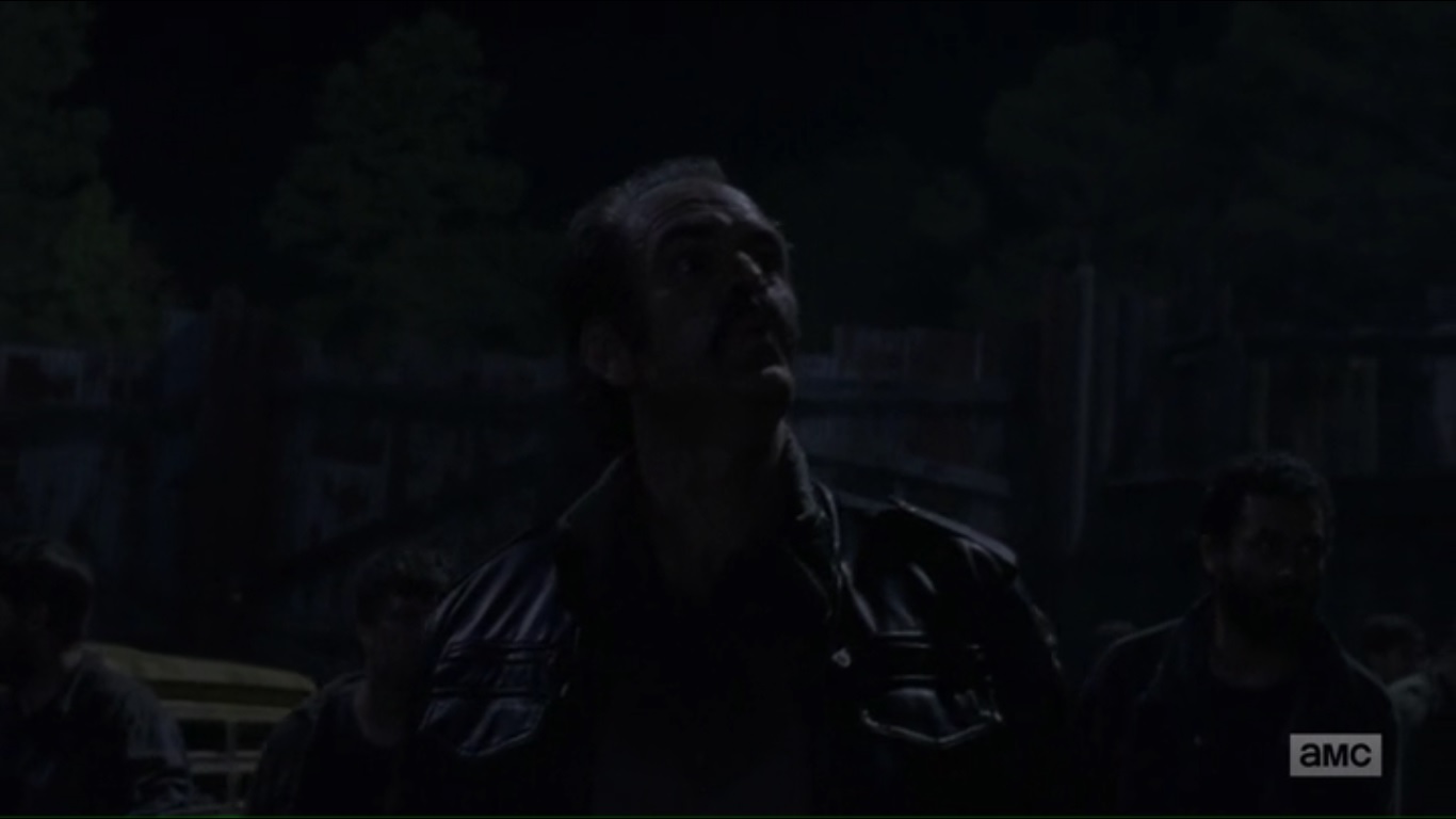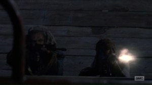 With all of the vehicle lights shot out, the Hilltop is even darker than it already is. In a move I can only chalk up to bad writing or pure stupidity, the Saviors slowly advance in the dark towards their target, who not only has the home field advantage, but can no doubt see them while the Saviors are walking blind.
