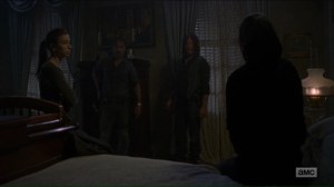 And then there’s Tara, who is still resting. Rick and Daryl enter and tell her, Enid, and Rosita that the Saviors infected their weapons, and most of the people hit by those weapons turned. Daryl reminds Tara that she said she was done waiting, and he still laments not killing Dwight. While Tara wanted Dwight dead, she realizes that Dwight wanted to be on their side. Karma’s a bitch.