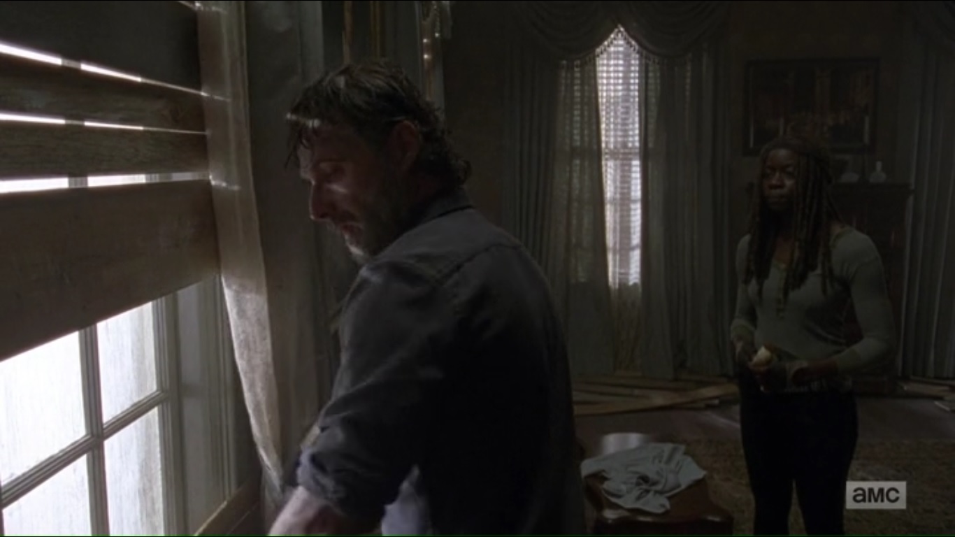 Since Maggie’s turned off the generator, Rick is hard at work opening up the windows so people can get some air. He ignores the turnip that Michonne brought for him and tells her that he saw Negan at the back of the Savior convoy, which is why he tried to kill him.