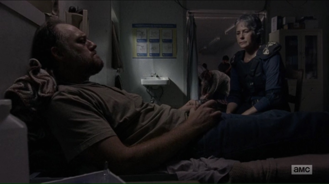 In the infirmary, Carol and Tobin have a moment to talk. He tells her that she doesn’t owe him anything for how she suddenly ended things. She was trying to live a life, but then there were more Saviors out there, so she couldn’t just keep living.