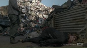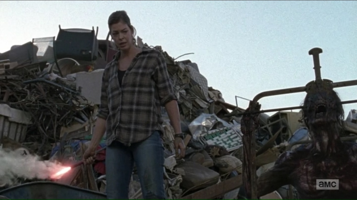 The episode begins with a flashback to “The Lost and the Plunderers” at the junkyard during the shootout as Jadis covers one of the members under some blankets. She hides, covers herself in blood, and plays dead while the shooting continues. A Savior approaches, but pays her no mind. When the chaos stops, Jadis strips down to her nightgown underneath.