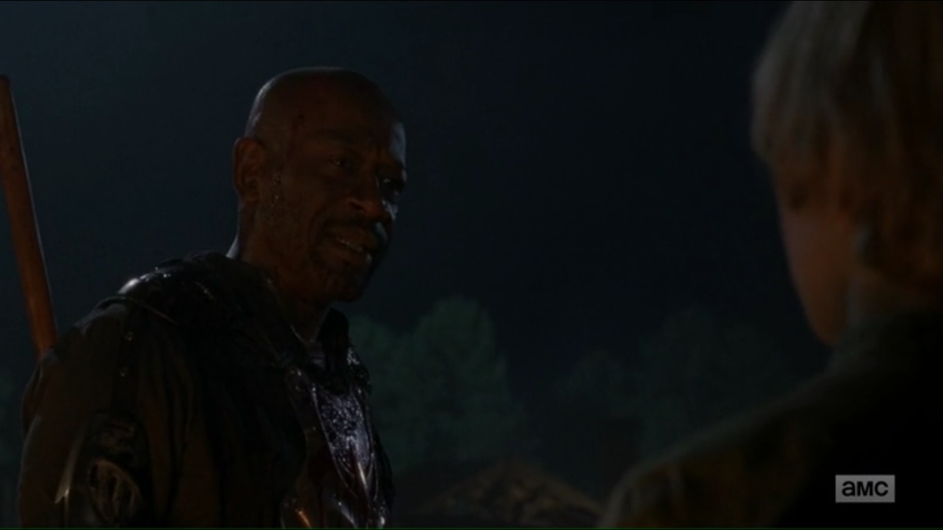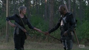 So Morgan and Carol search the woods for the Saviors, when Carol finds a turnip, indicating that the Saviors were on this side of the road. They spot who Morgan believes to be Henry, but it’s just a hallucination. Morgan believes that Henry is dead, but Carol admits that she just came to keep an eye on Morgan. He knows that she saved people, but she can’t save the dead.