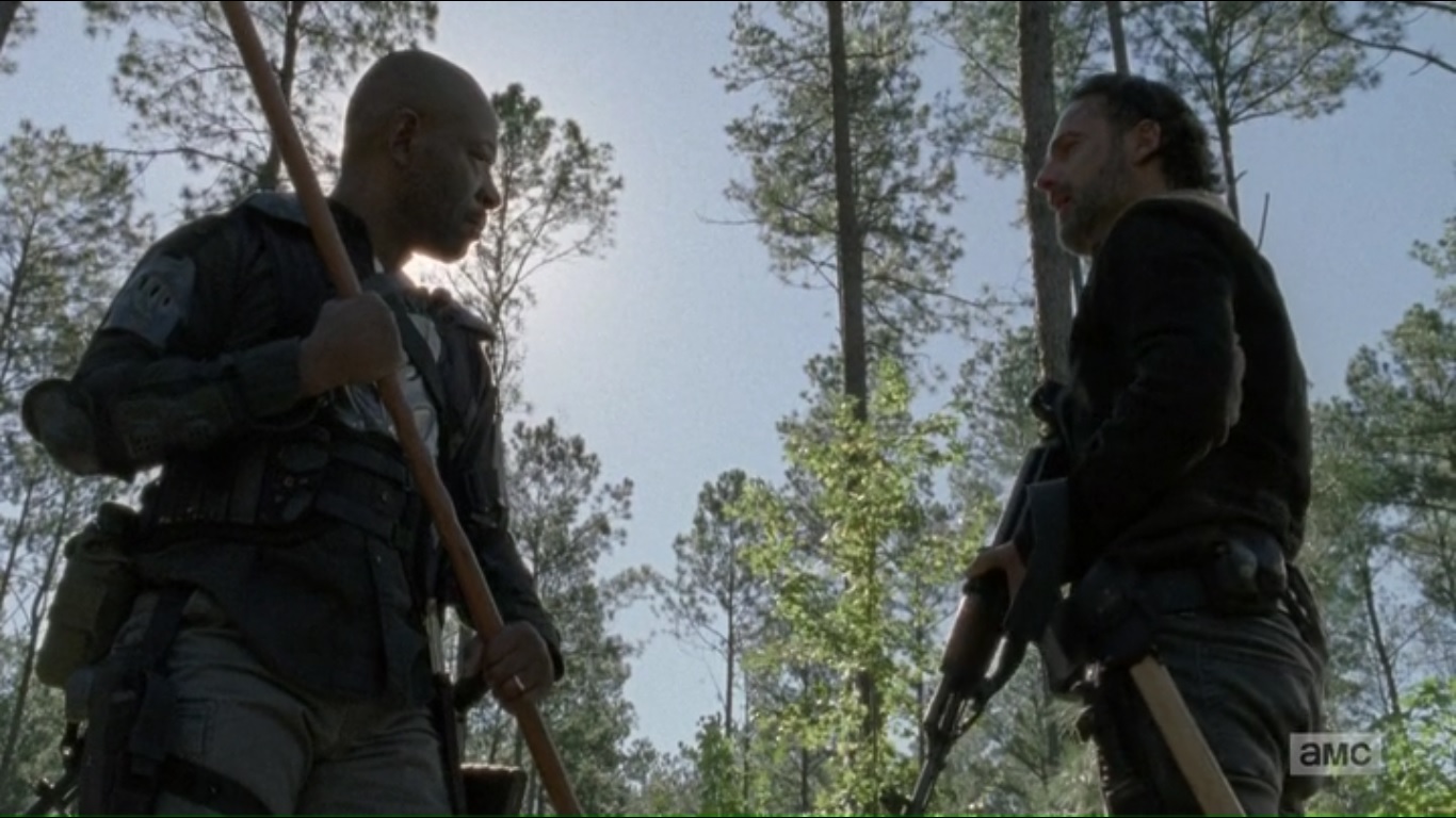 Rick explores the woods and runs into an enraged Morgan, who admits to Rick that he isn’t right. Rick realizes that he and Morgan are out here for the same reason, so they should finish it, the two of them. As they approach a severed hand and foot, the two are ambushed.