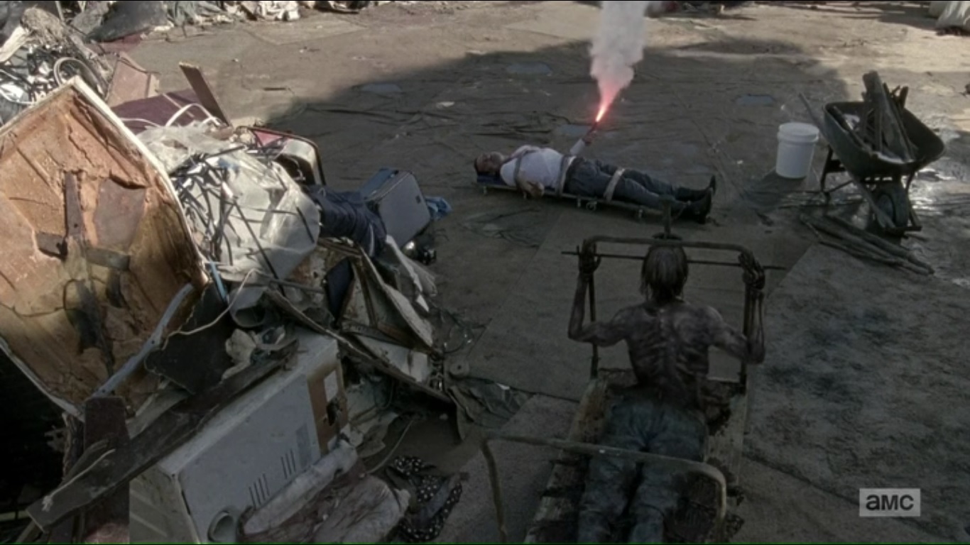 We return to the junkyard, where Negan continues to insist that he had nothing to do with the massacre. As Jadis leaves and returns with her armored walker, she sees that Negan has rolled himself just enough to grab a gun and flare.