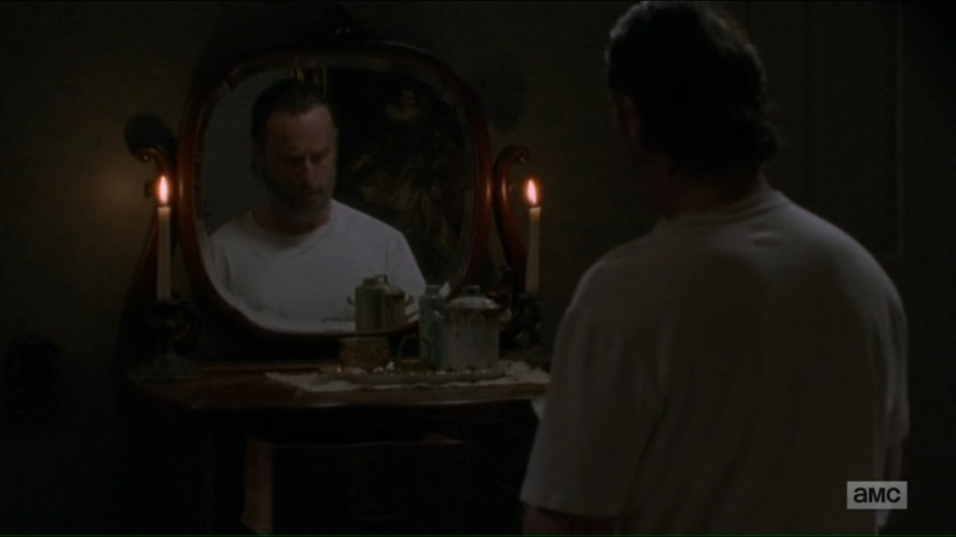 As Morgan leaves, Rick eyes himself in the mirror. There’s always a mirror nearby for Rick to see what he’s become, haven’t you noticed?