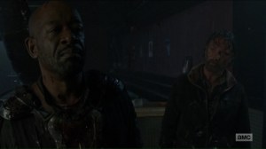 On the road, Carol and Morgan spot a horde of walkers in the distance. Carol spots an approaching walker with Henry’s spear sticking through it. Morgan downs the walker with said spear, and Carol wants to find the other road, though Morgan believes they know what they’ll find. Carol, though, won’t know unless she goes and sees for herself. Morgan, though, refuses, again saying that Carol saves people.