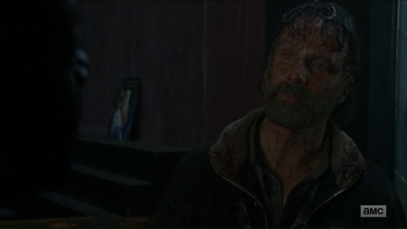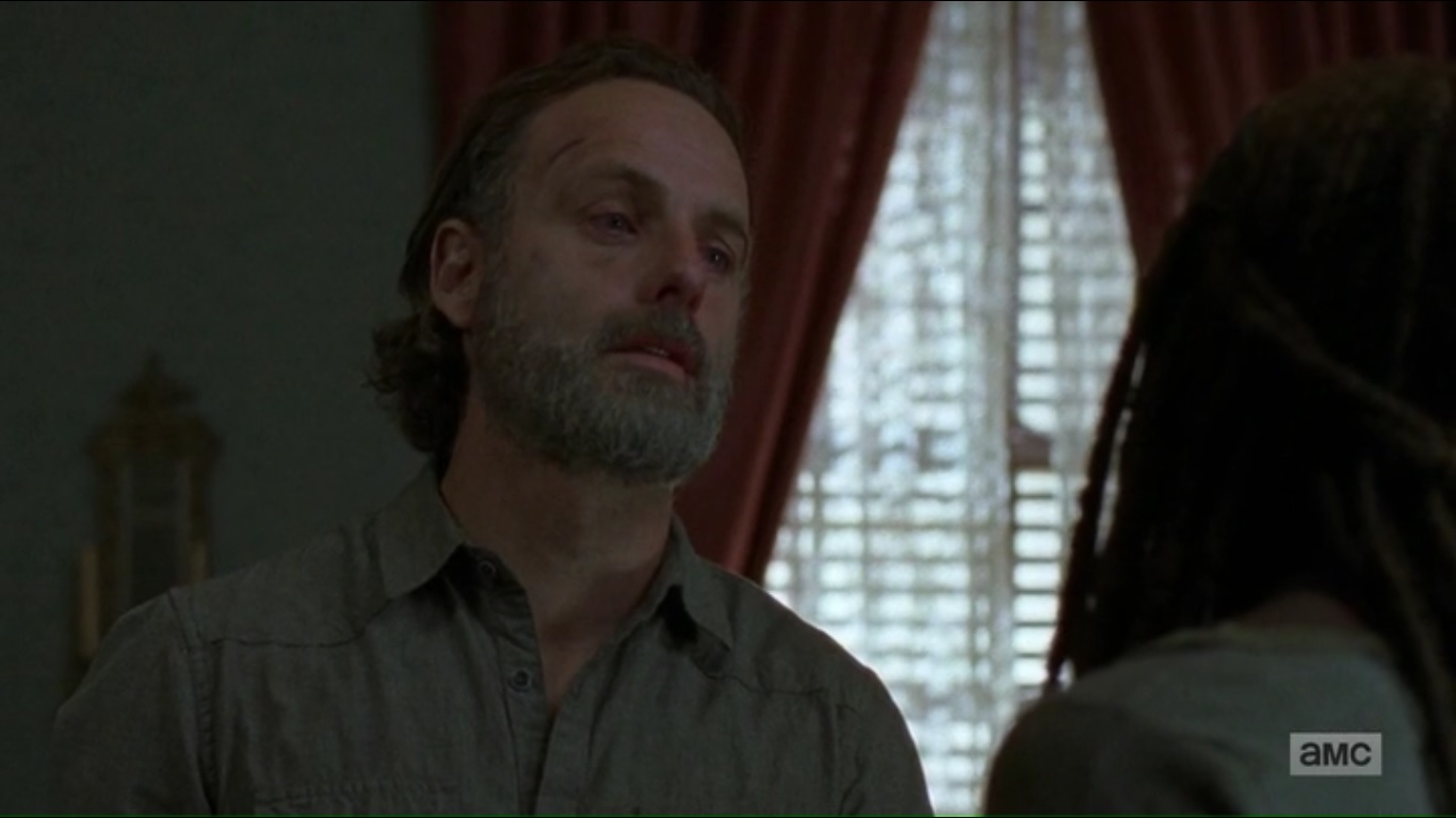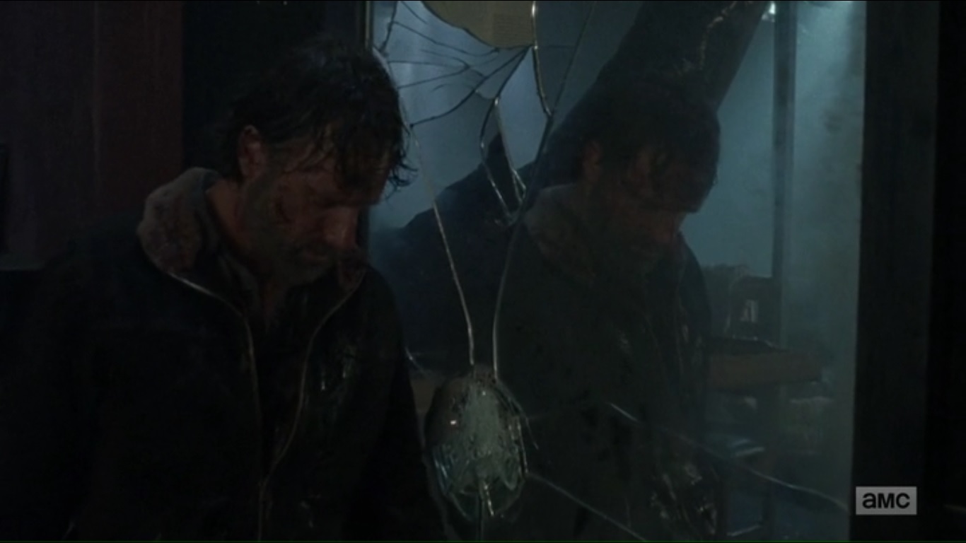 And yes, I do find it very on-the-nose that Rick Grimes once again finds himself in the convenient position of looking in a mirror to see how far he’s fallen and so he can look at the monster he’s become. It was one thing for Gracie to have a mirror above her crib, but for Rick to look at one here, too? And a cracked mirror, even? Why not just spell out that this is supposed to be symbolism?
