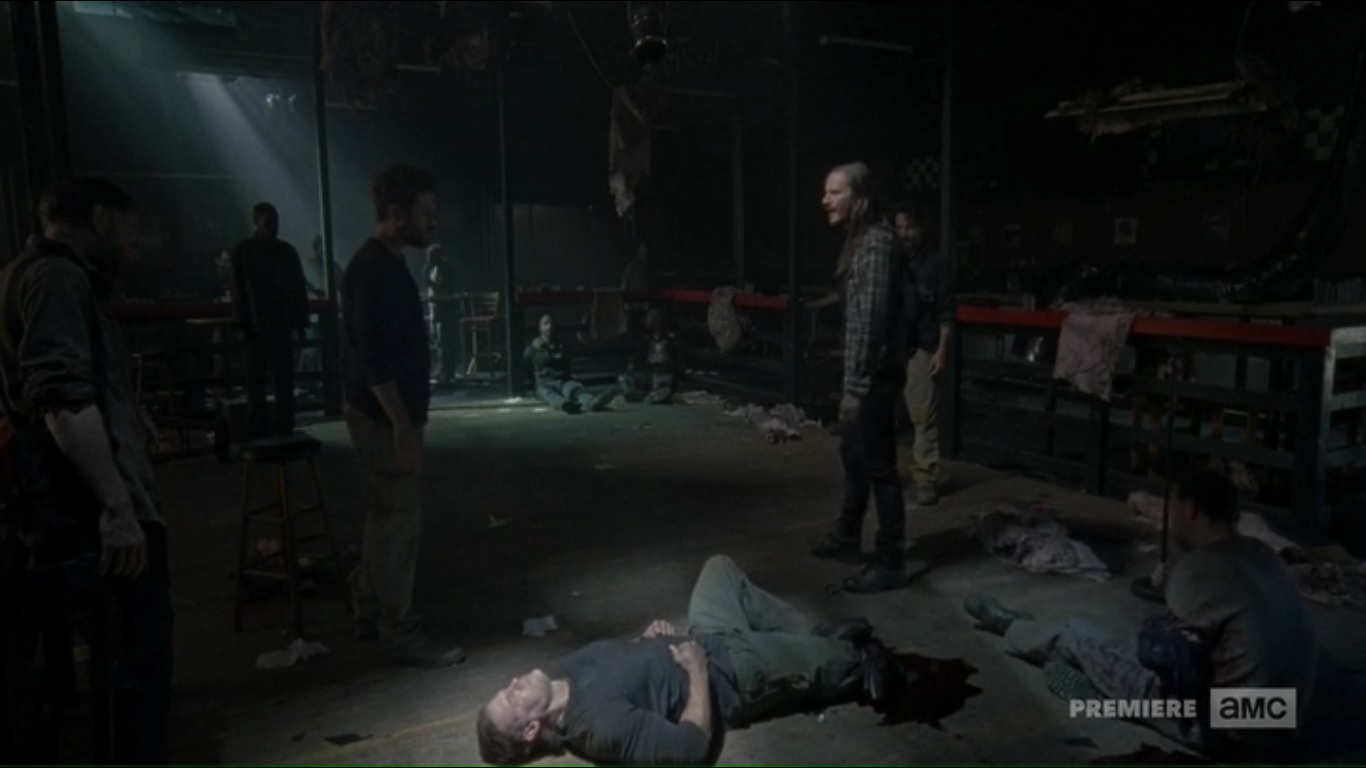 Soon enough, the walkers stream into the building. As Jared escapes, the remaining Saviors cut Rick and Morgan loose. They join forces and cut down as many walkers as they can, but then Rick and Morgan turn and kill the Saviors as well. Morgan, though, locks his sights on Jared.