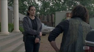 Tara tells Daryl that she’s still not sick, a day later. She figures that Dwight shot her with a clean arrow, but Daryl disagrees. If Dwight knew, he should’ve warned them. Everyone else injured got sick, so it can’t be an accident that Tara lived. Had Tara killed Dwight when she had the chance, she might be dead right now. She tells Daryl to do what he has to do, but it’s just for him. Tara, though, she’s out.
