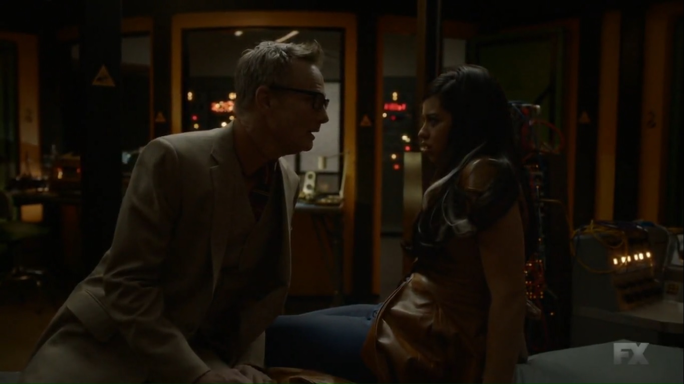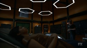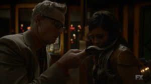 The hunt for Farouk’s body begins. As night falls, David, Syd, and Ptonomy go for a ride with Division Three and Admiral Fukuyama’s associates. David tells Ptonomy that the Admiral wants Oliver dead when found, so the mutants will have to find him first. Fukuyama’s associates, by the way, go by Vermillion, and aren’t mutants, but synthetic androids.