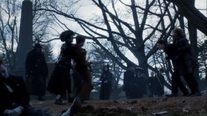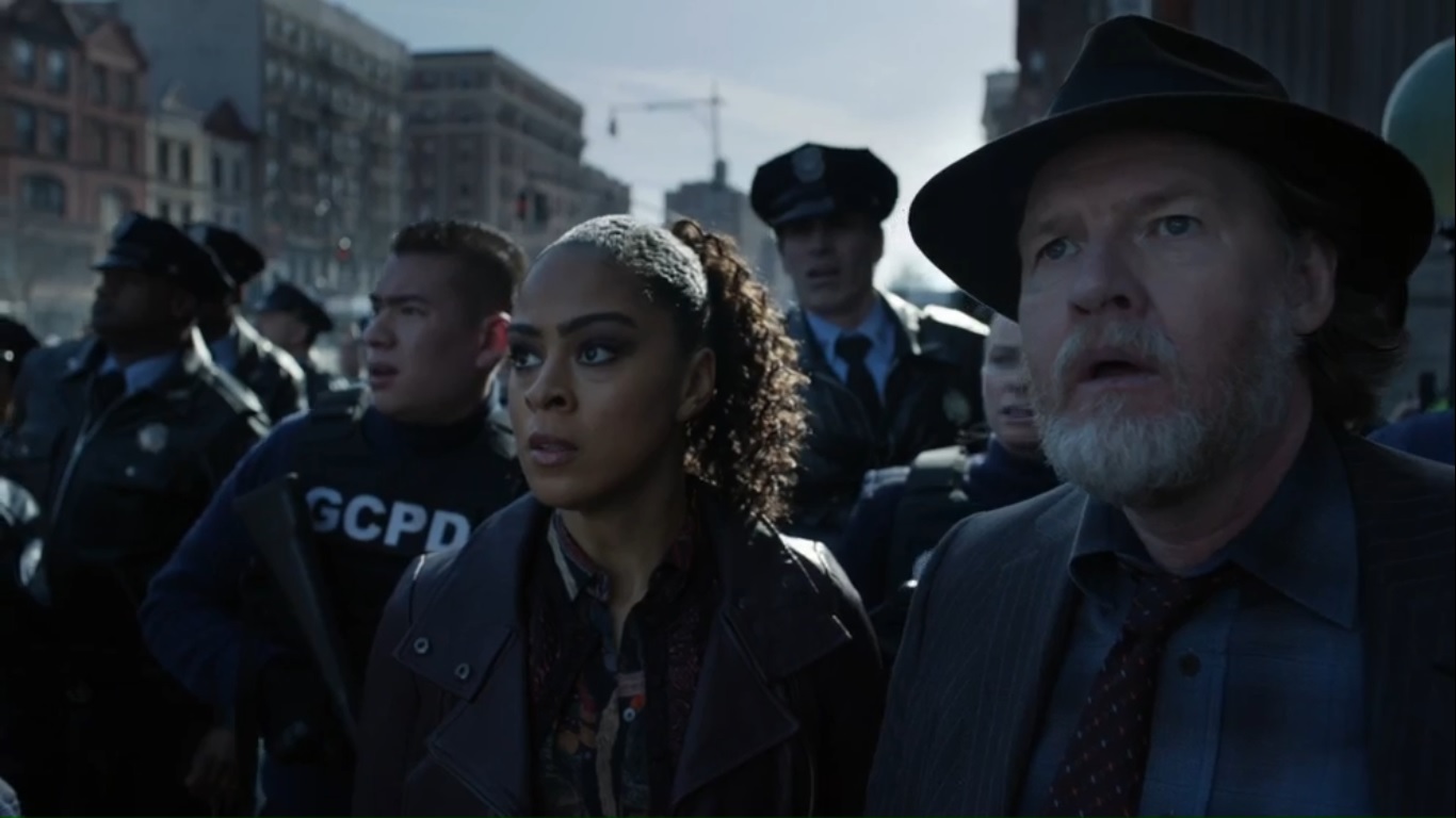 The mob continues bashing the door to try and enter while Jim informs Leslie that she’s going to be transferred. She, though, wants him to come to the Narrows and see how things operate. But before Jim can weigh his options, the mob breaks through the doors. As they lay waste to the precinct, the officers fall back on Jim’s order. Leslie, left in Alvrarez’s hands, is knocked out when she hits a wall.