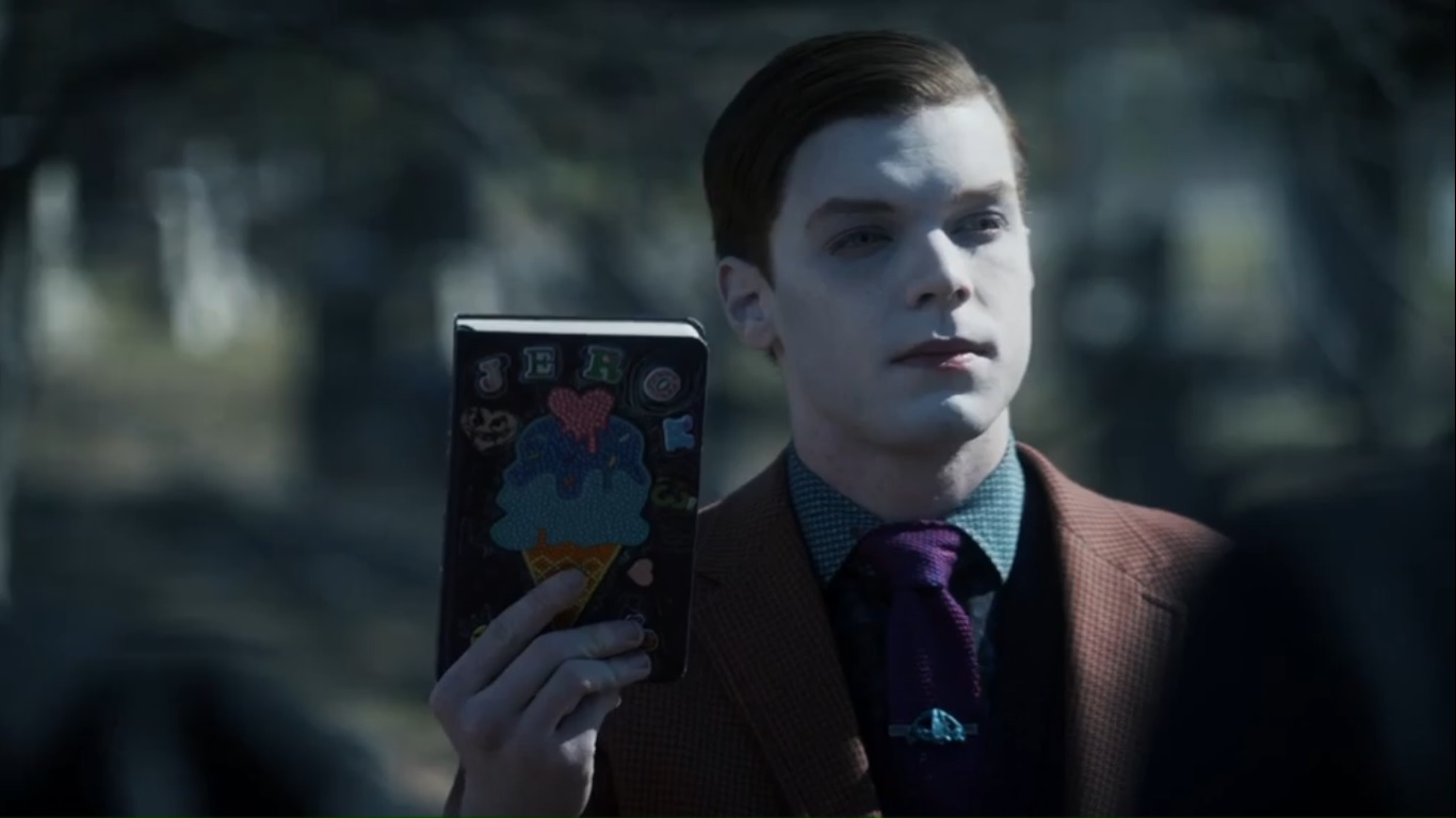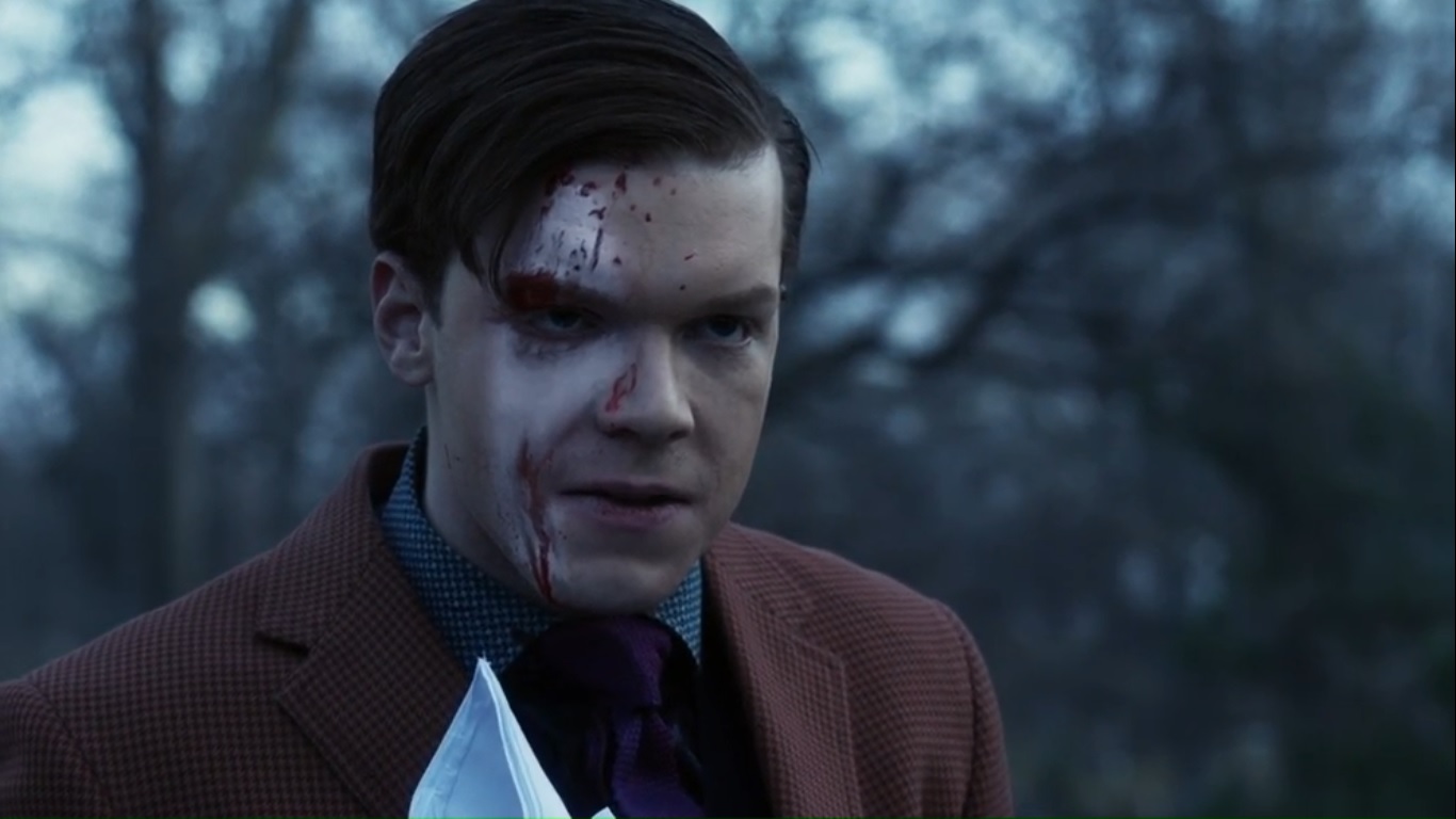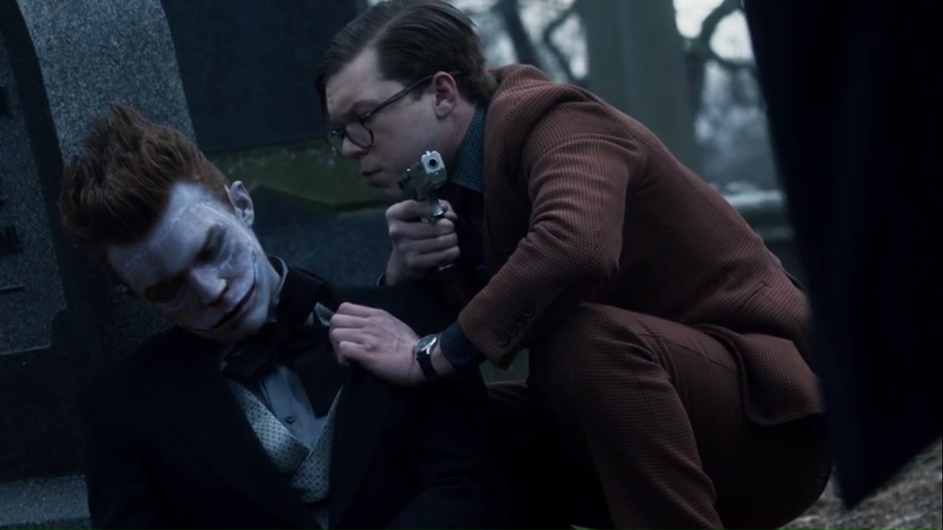 Then Harvey and Lucius present a gift, courtesy of Jerome Valeska. They play the video tape and it turns out to be Jerome’s Last Will and Testament. On said video, Jerome acknowledges that thing didn’t go his way. He wants Jim to throw him a wake at the GCPD, and the invitations have already been sent to the guests.
