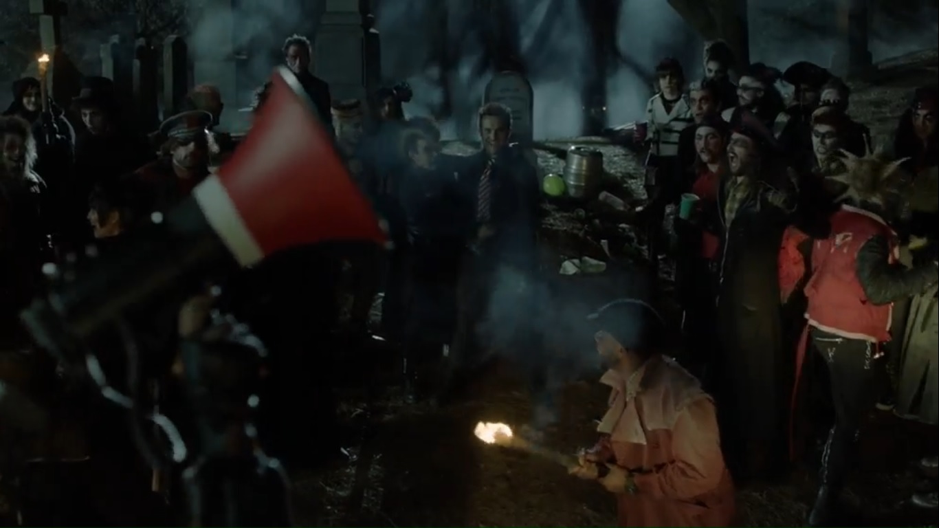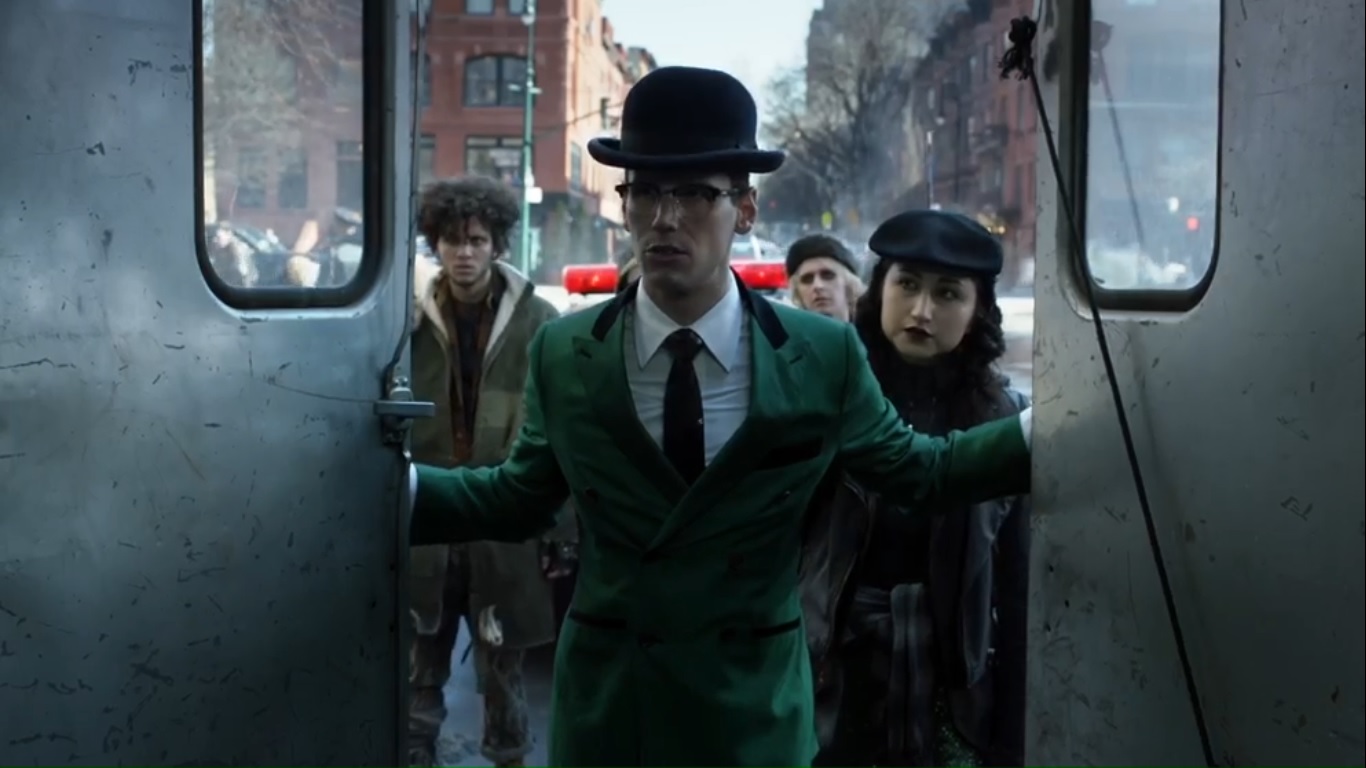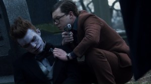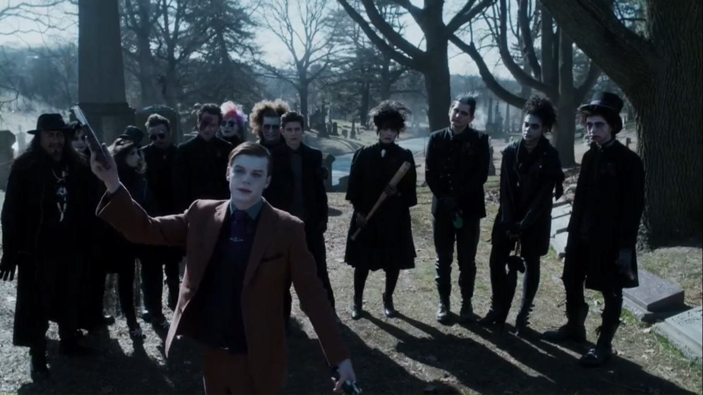 The episode begins with Jerome Valeska’s funeral, as a group of his followers drink to their fallen leader. A motorcycle approaches and a person in a Harley Quinn-esque outfit joins the group…uninvited. She plays a message on a tape from Jerome: even though he’s dead, he has one last task- dig up his body. So the mob gets to it.