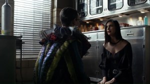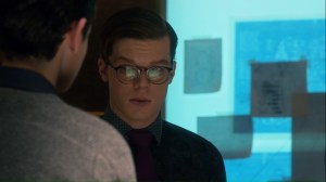 So Riddler’s outfit is that of a clown and he’s given a drink right out of Jerome’s coffin. Classy. As the mob continues its assault, Nygma slips into the medical examiner’s lab and is knocked out by Leslie. By accident.