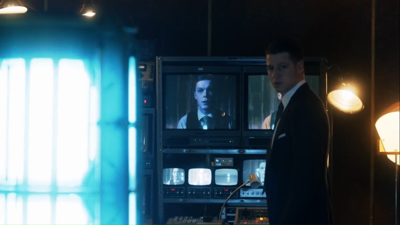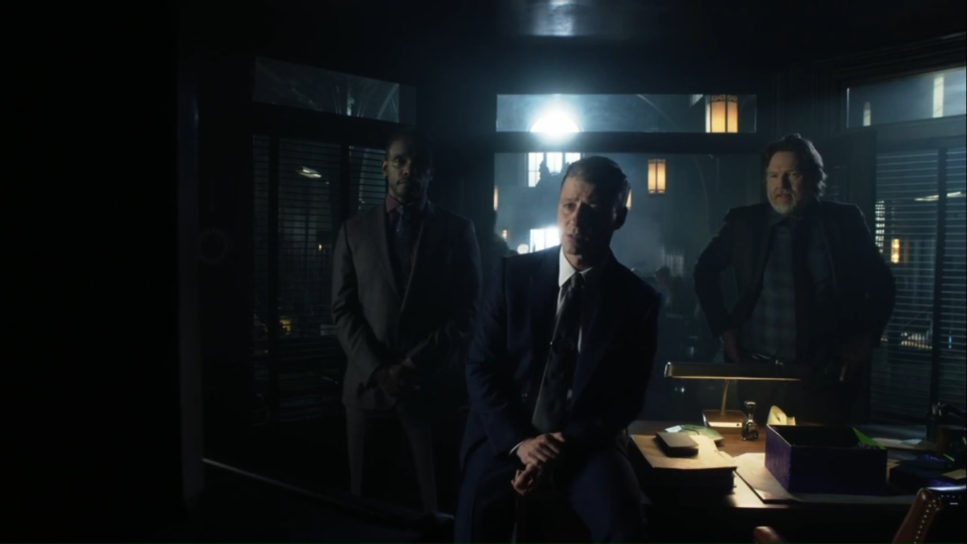 Everything else was fine. Serviceable, but the Leslie/Riddler and Penguin/Butch stuff did at least somewhat tie into the Jeremiah stuff because both teams ended up at the precinct for reasonable explanations: Riddler went to free Leslie, while Penguin and Butch went to grab a member of the mob for information.