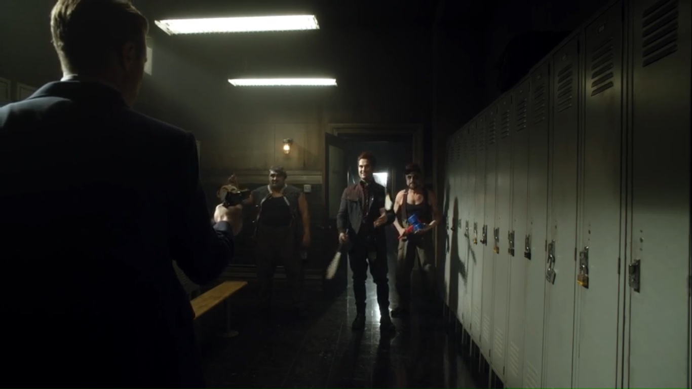 Some of the mob corners Jim in the locker room, ready to carve him up, but they’re immediately subdued by Harvey, who has arrived with Harper.