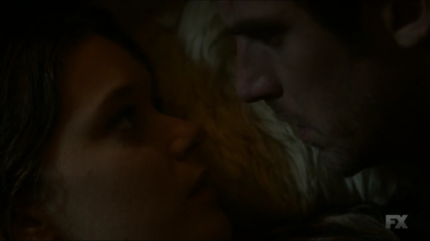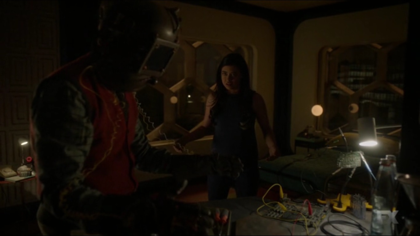 In her room, Syd rests on a rug and David appears to her through a projection. His body is still in his room, and they don’t need the white room to have physical contact anymore. So they kiss and declare their love for one another, and then David asks Syd to run away with him. They should find a cabin by the lake, get a dog, some chickens, and start a farm. All after the business with Farouk is done.