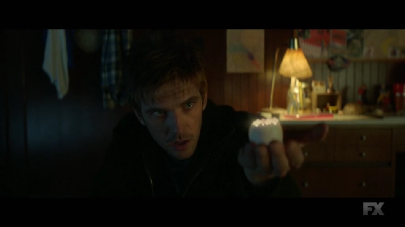 Then David awakens in his childhood bedroom. On television, Jon Hamm’s lessons play as another David- Divad- appears and tells his counterpart that a delusion starts like any other idea- an egg. David says that everyone didn’t know about his true potential, but then Syd came and now he knows that he’s special. An omega level mutant. He’s the one who saves everybody. Farouk is the devil, but Syd can’t see that.