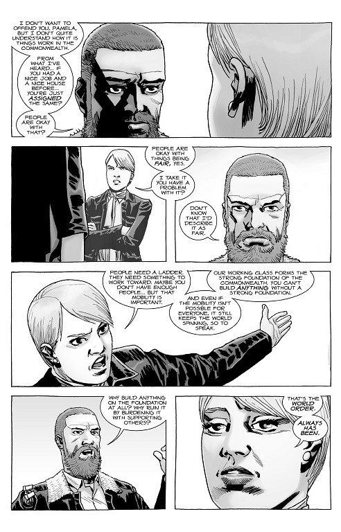 Not for Pamela. To her, this is the world order. And if that’s the case, in Rick’s mind, it may be time for a new world order. Not the best way Kirkman could’ve integrated the name of the story arc into the comic, but it’s fine. This ending is made to seem ominous, but I don’t think this necessarily means Rick and Pamela are about to go to war. They see things in very different ways, but they’re not looking to change each other.