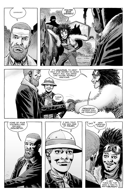Then Rick is introduced properly not just to Pamela, but Princess as well since, hey, she’s just as new to the community as Pamela. And she’s just as full of energy as she was when the others met her on Pittsburgh. Though I’m curious whether she ends up staying in Alexandria, much to Magna’s chagrin, or indeed takes up residence at the Hilltop. She’ll have to take that up with Maggie, though.