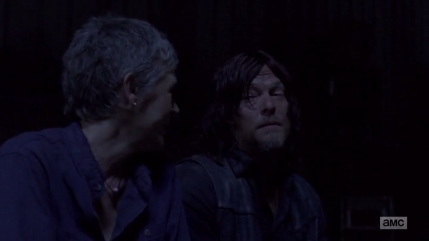 Back at the Sanctuary, Carol finally has a moment alone with Daryl and the first thing she does it put out his cigarette. Rude. She knows why Daryl isn’t asleep- he doesn’t sleep. Ezekiel, though, sleeps like a baby. Still, Daryl finds Ezekiel corny, but after what Carol went through with Ed, corny is perfectly fine. And Daryl is happy for her, as she’s the one who definitely deserves to be happy.