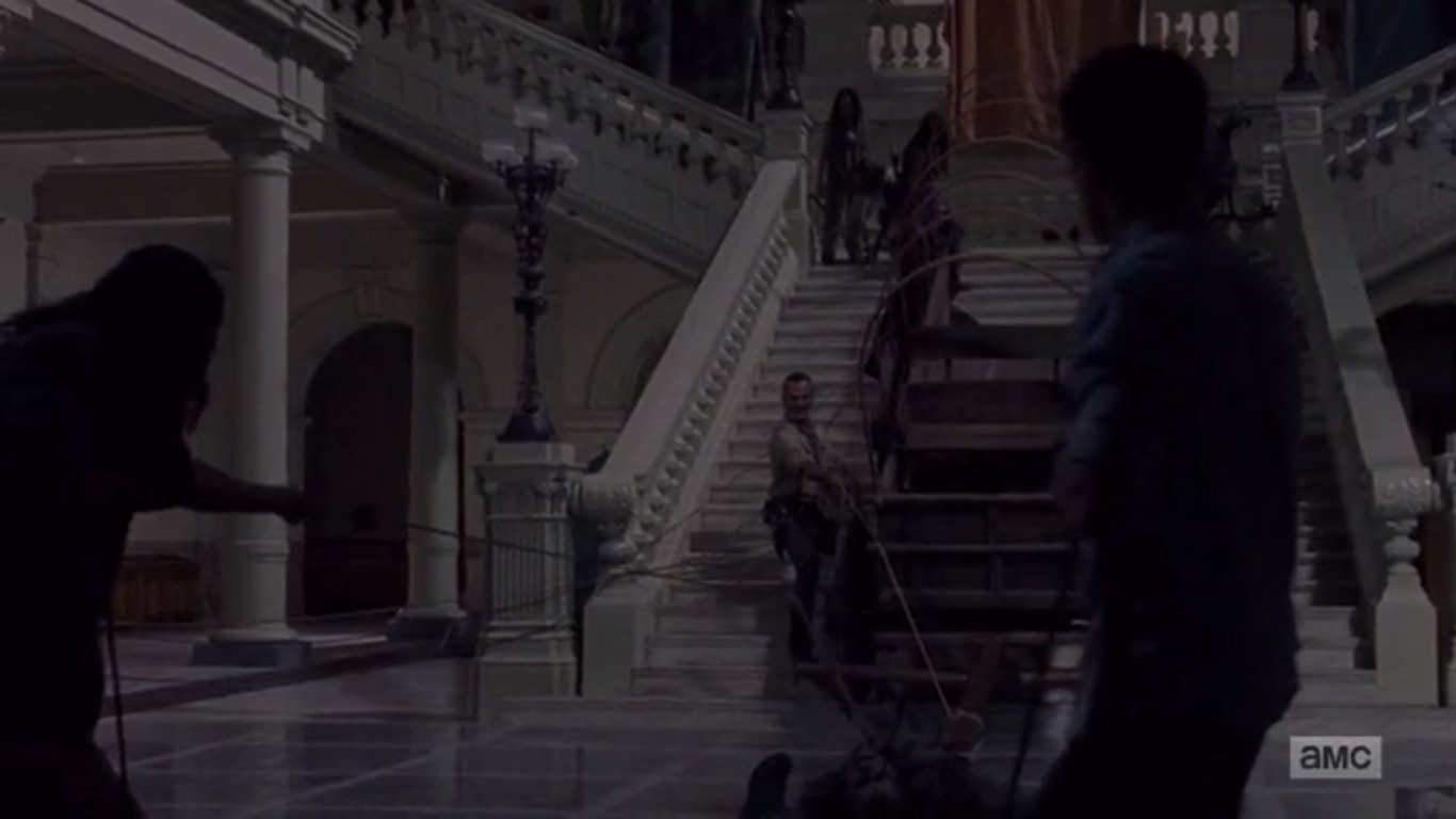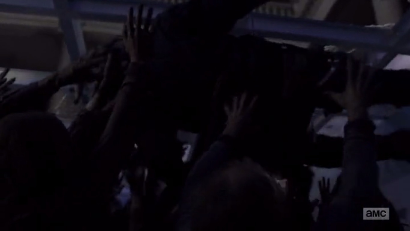 The glass finally cracks and Ezekiel is the unlucky one to fall through, but he’s still attached to a rope, so everyone pulls him back up before the walkers can feast.