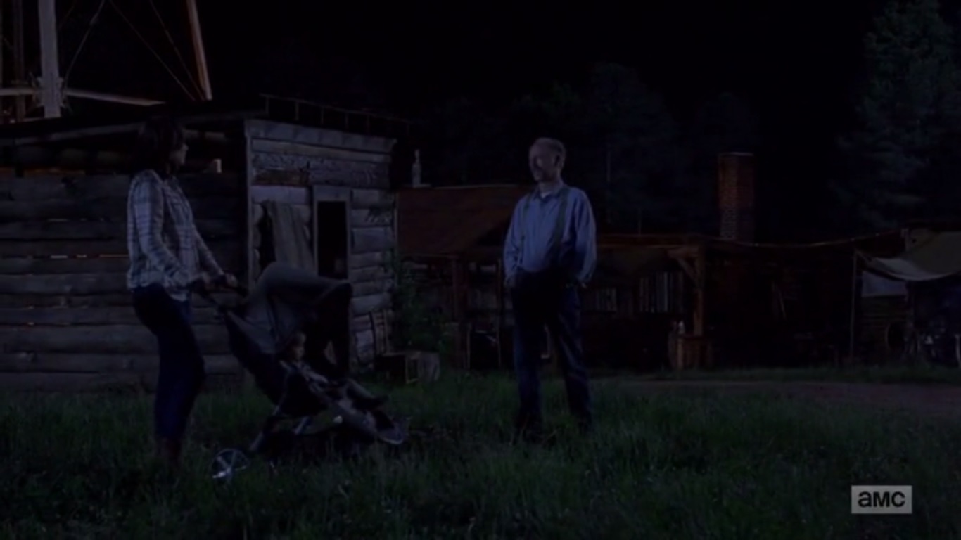 In fact, let’s go back to the Hilltop, where Maggie picks night as the perfect time to take baby Hershel for a walk. Gregory joins her and explains that he knows what it’s like to be in a tough position like the one she’s in right now. And he’s not bitter about losing the election to a worthy adversary like Maggie. Good to know, I guess. It forced him to do some soul-searching.