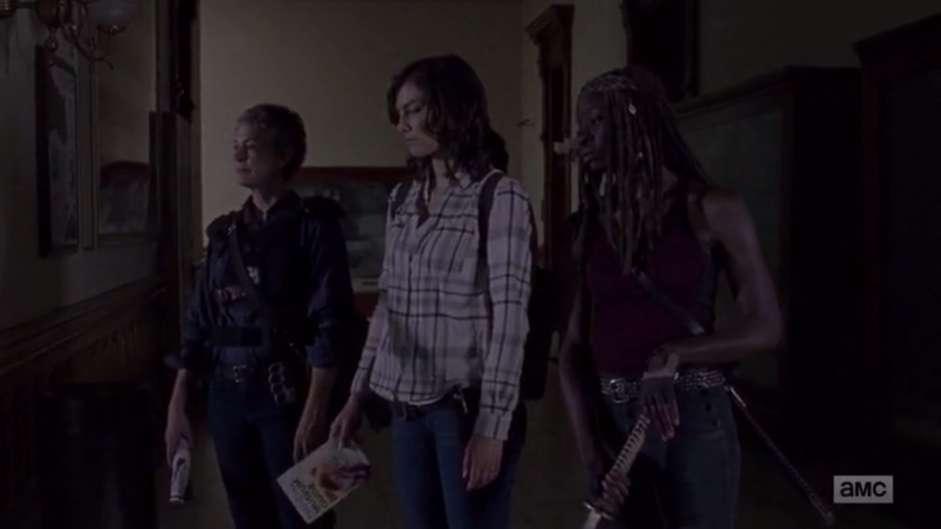 Meanwhile, Maggie tells Michonne and Carol that Gregory called for an election at the Hilltop. Presumably, he lost, but hey, it’s a sign of the democratic process returning. It’s certainly different than Carol’s situation, given that she lives with a king. Michonne comes to a stop when she eyes a Civil War exhibit, but the three finally find something that the Hilltop’s blacksmith can use.