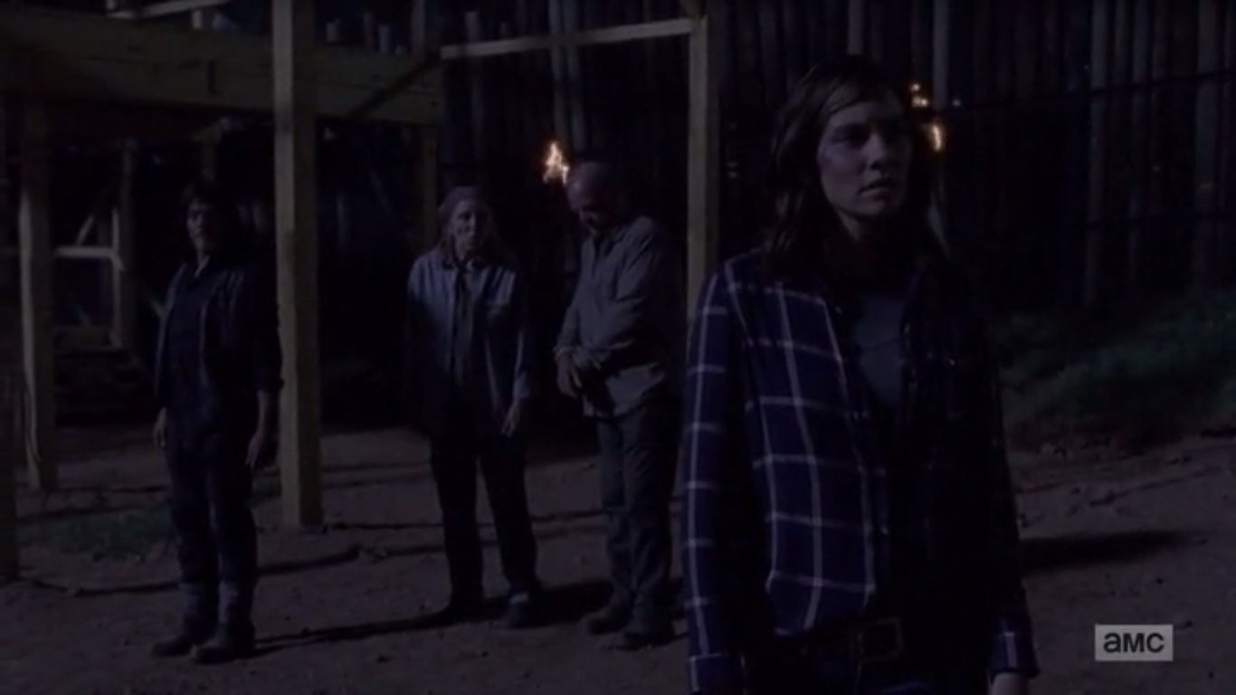 Later that evening, all of the Hilltop has assembled for Gregory’s execution. She tells them that she doesn’t want to do this, but at the Hilltop, the punishment fits the crime. She asks the punished if he has any final words. He tells Maggie that she’s ashamed, but she disagrees.