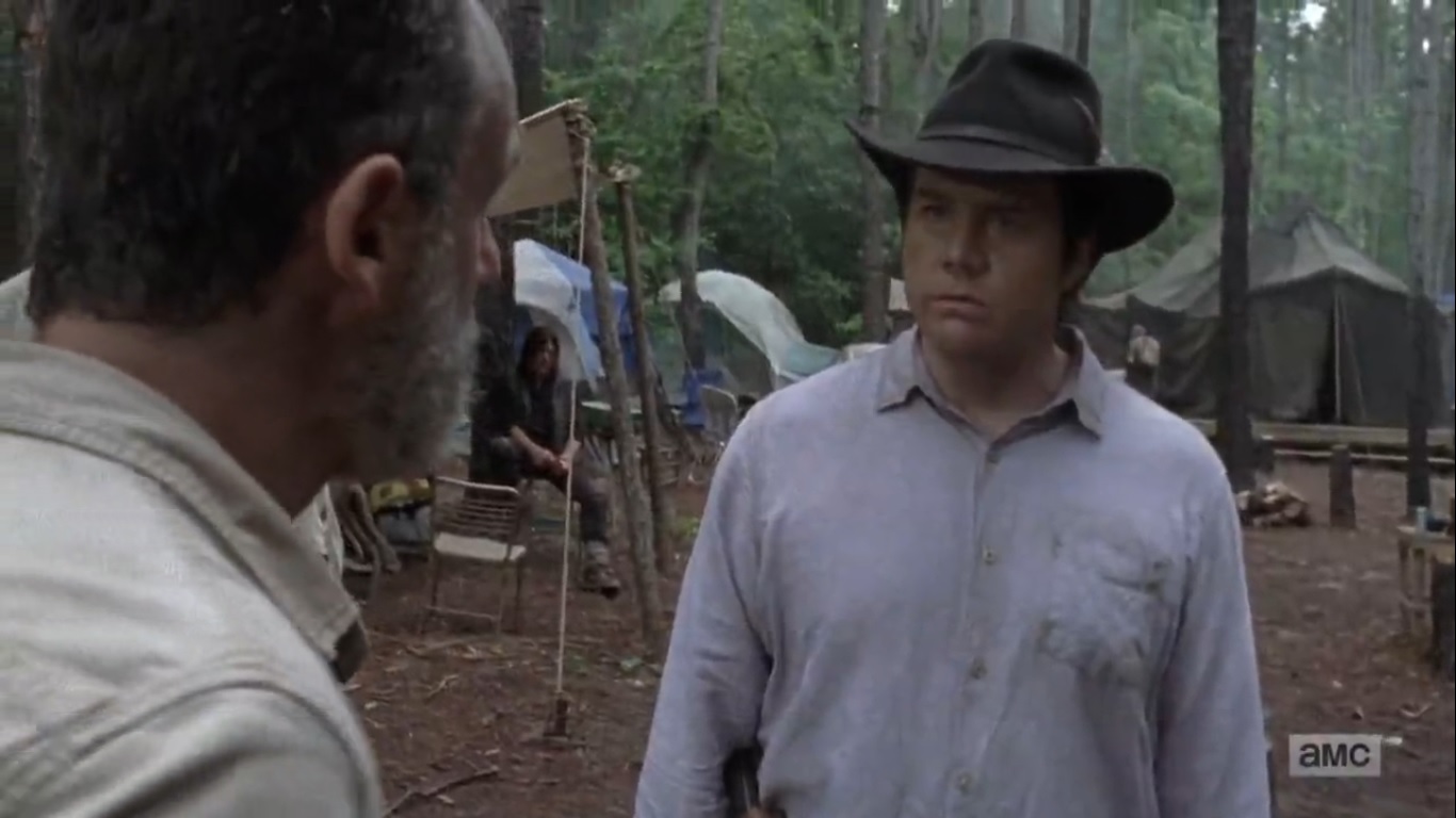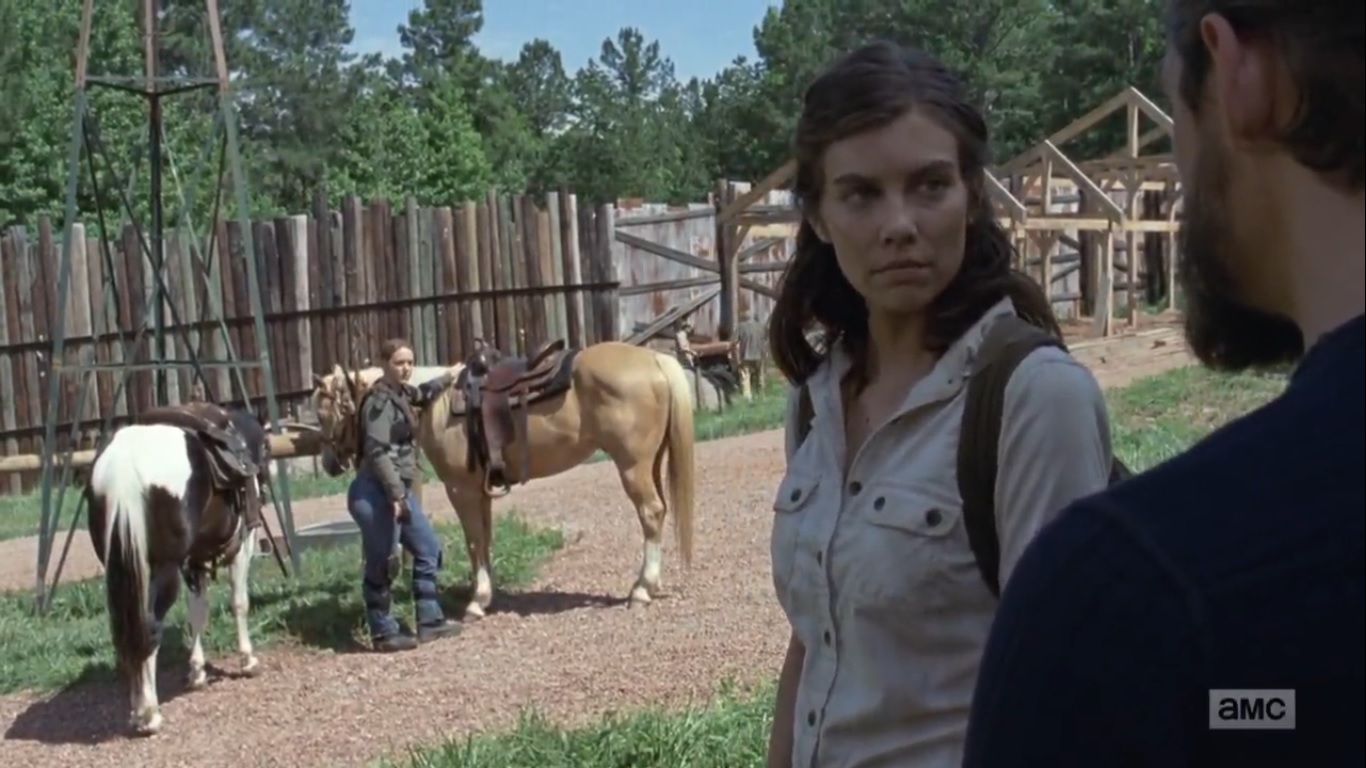 Then Jerry arrives to tell Rick that Maggie is heading to Alexandria, based on what Jesus said. He didn’t say much more, though. Rick radios to Alexandria to get an urgent message on alerting Michonne and do not let Maggie in. He radios for Maggie to talk, and Rachel, who is on the road, says that Maggie is done talking. And that is Rachel’s contribution for the episode. Make a note of it.