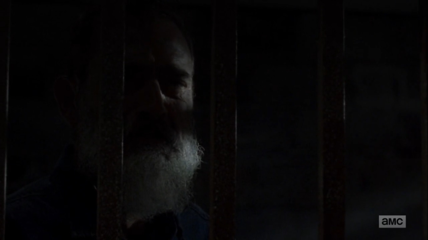 Back at Alexandria, Michonne returns to working on the rules when she eyes her blade. She returns to Negan’s cell with a plate of food and wants to know why he said what he said. He wasn’t trying to piss her off, and he cares what she thinks because she never comes down here. It’s always Rick. To him, they’re the same. Both of them are trapped and connected to the dead, and Negan knows that Michonne can’t stand that.