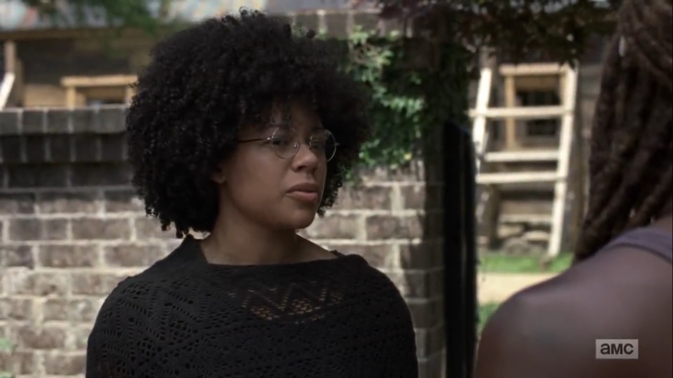Over at Alexandria, Michonne greets Nora, played by Tamara Austin, who tells her that today will be a bad day. A fourth of the tomatoes have gone to the crows, but once the windmill gets up and running, they should be fine. Also, Scott tried feeding Negan, but he’s not eating. Michonne opts to head down and give it her own try.