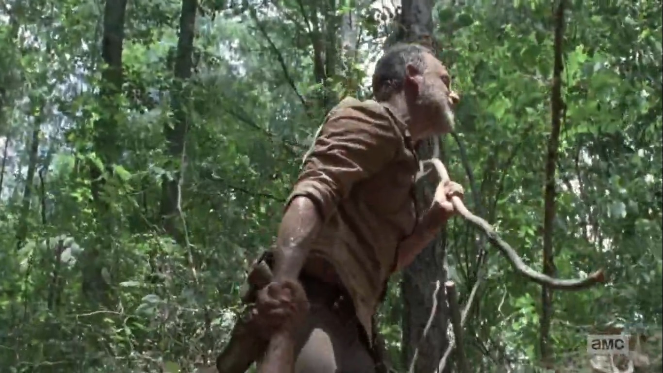 Walkers start falling into the plot hole, so Daryl knives each one that makes its way into the hole. The two use the walkers as steps, but soon enough, too many are falling in and now ready to grab at Rick and Daryl’s feet. S Rick finally crawls out of the hole, he grabs a branch and uses it to extend his reach so Daryl can grab his hand.