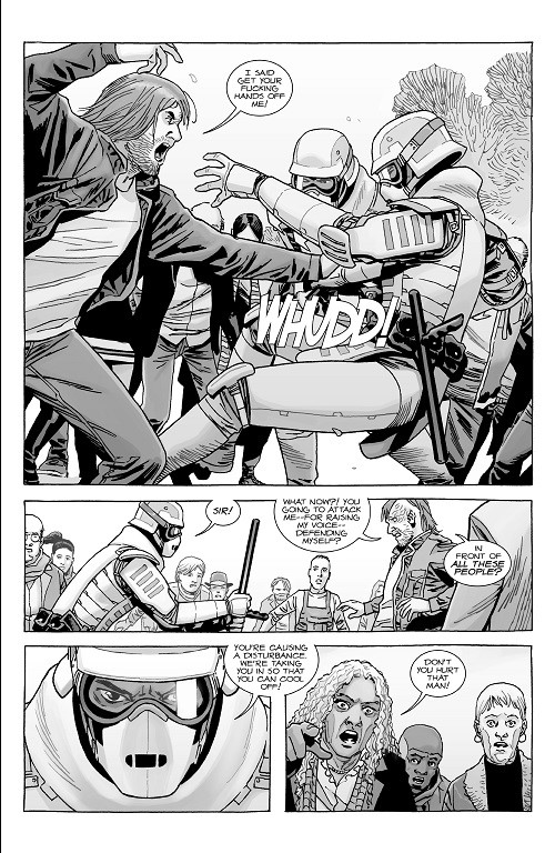 Rick Grimes never asked to be a leader. He just ascends into that position. But one thing you can’t argue- he does his damn job and he does it well. He became leader of Alexandria and the people have grown accustomed to his leadership. Not because he forces his way of thinking on them, but because he works with them. I mention this because it will be very important when we get to the end of this issue.
