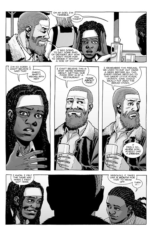 We’re back at the Commonwealth for the bulk of the issue, starting with Rick, Michonne, and Elodie dining and Michonne inadvertently insulting the profession of being a waitress. Hey, someone has to get the work done, Michonne. But hey, it may have just been a slip of the tongue. Like when the group arrived in Alexandria, it felt very alien to have a sense of normalcy. Much more so at the Commonwealth.