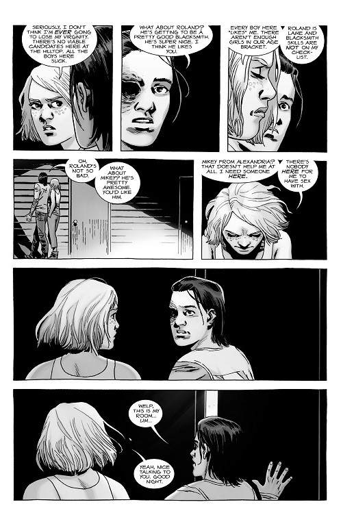 Look back at the cover of this issue. It’s Carl on watch at the Hilltop. It stands to reason that we’d get a lot of focus there, but as is, we’re only there for three pages. And it’s mostly Carl sneaking out of Lydia’s room and Sophia catches him. More than that, Sophia wants sex. A lot. She’s past the point of wanting to lose her virginity, but none of the other boys seem like appealing options.