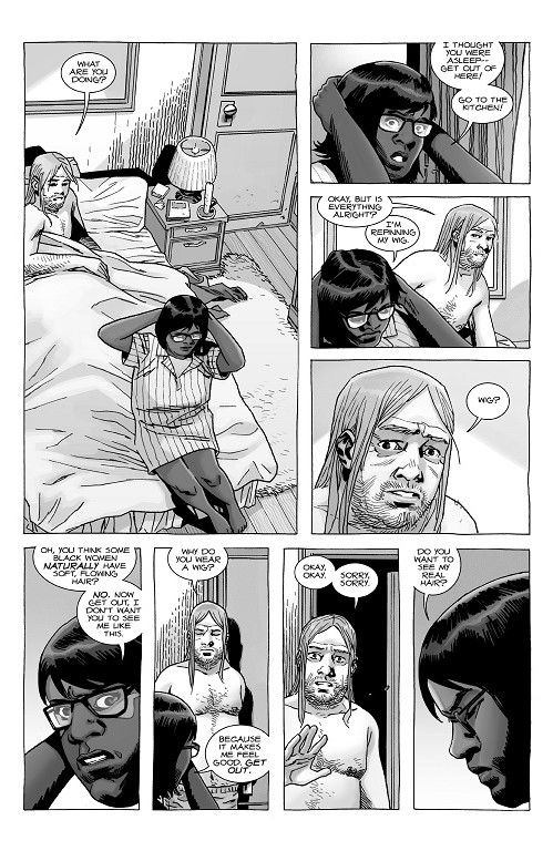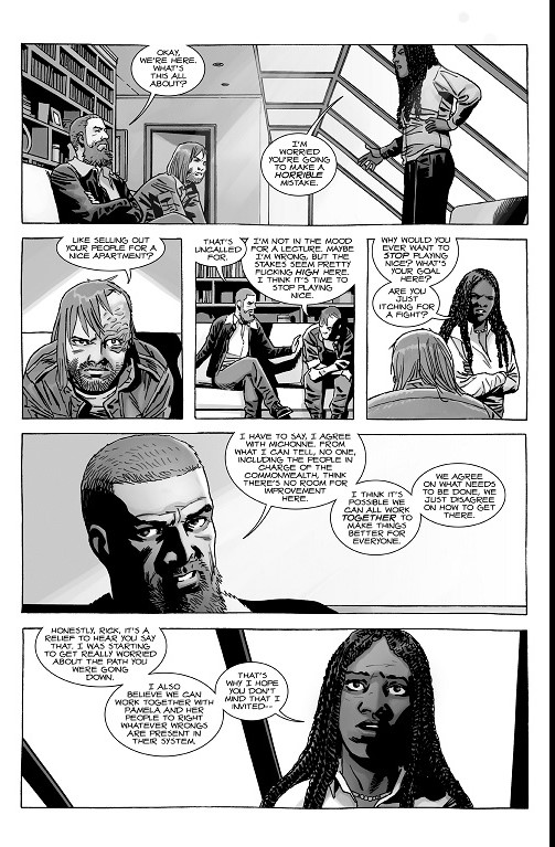 Plus, we see the ramifications of how Michonne’s actions are affecting people’s attitudes towards Elodie. I’m not showing the panel since it’s not necessary, but we see Elodie having lunch with some friends. They inform her that since Michonne defended the guards, people are pissed off and want to know what side Elodie is on and where she stands. Not that Elodie even saw it as sides until now.