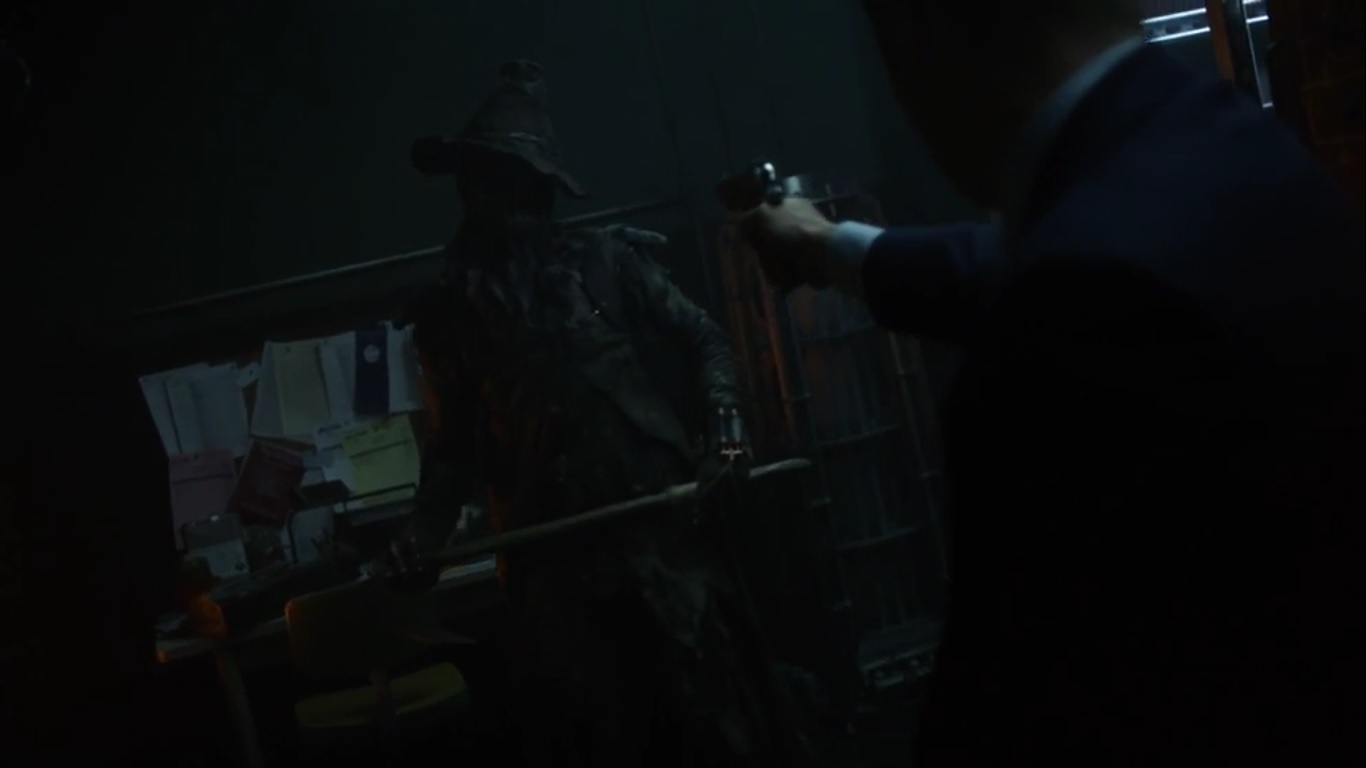 Back with the GCPD, some officers spot something moving in the darkness like a shadow. It turns out to be Jonathan Crane, who sprays one of the officers with a face full of fear gas and orders him to open the gate. He does, giving Scarecrow and his minions full access to show the people the face of fear.