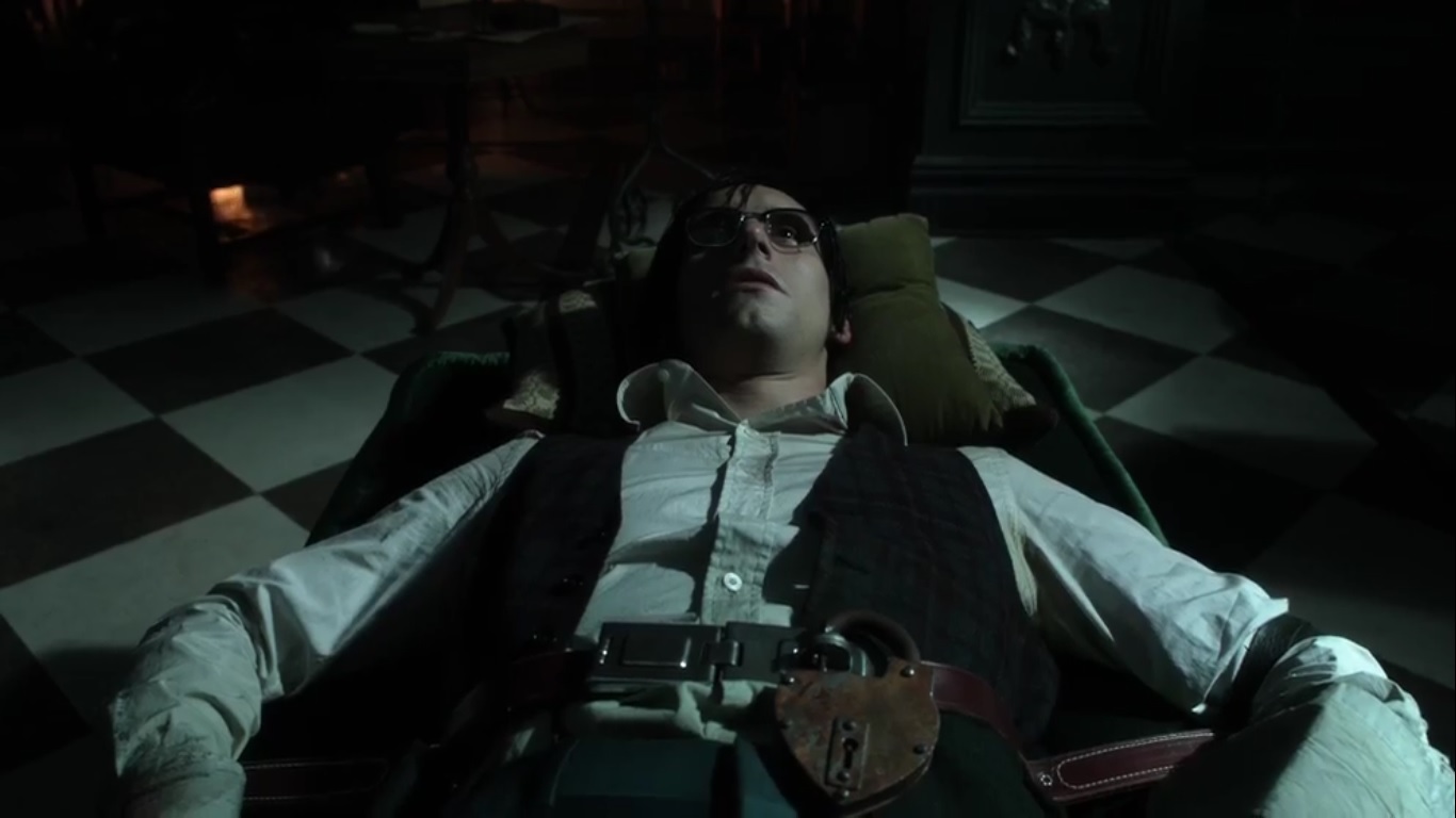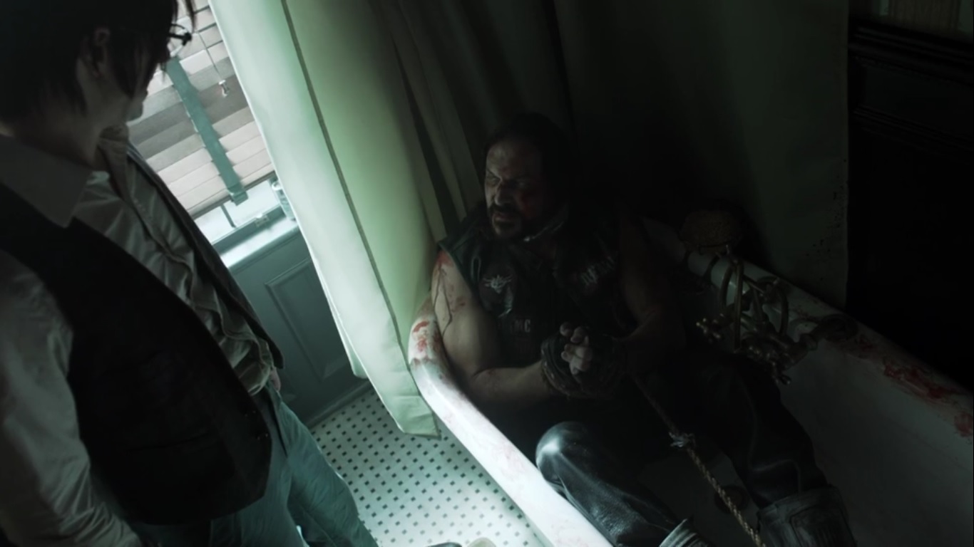 For once, Riddler doesn’t awake in a strange place, but only because he chained himself to his cot. As he heads to the bathroom, he hears a noise and soon spots someone bound and gagged in his tub. Apparently Riddler doesn’t remember this man, Tank, played by David Kallaway, who is part of the Street Demons gang. As for why he’s here, Riddler brought him here last night.