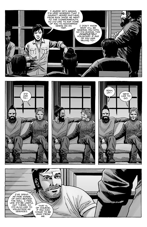 Siddiq arrives at the Hilltop and informs Maggie of Magna’s plan. To no one’s surprise, Maggie agrees that it’s time to pay the Commonwealth a visit. Aaron, Jesus, and Dante will be accompanying Siddiq on this visit. The plan is just to survey the territory. If everything appears to be fine, then just say they’re checking in. But if not, then head back in a hurry.