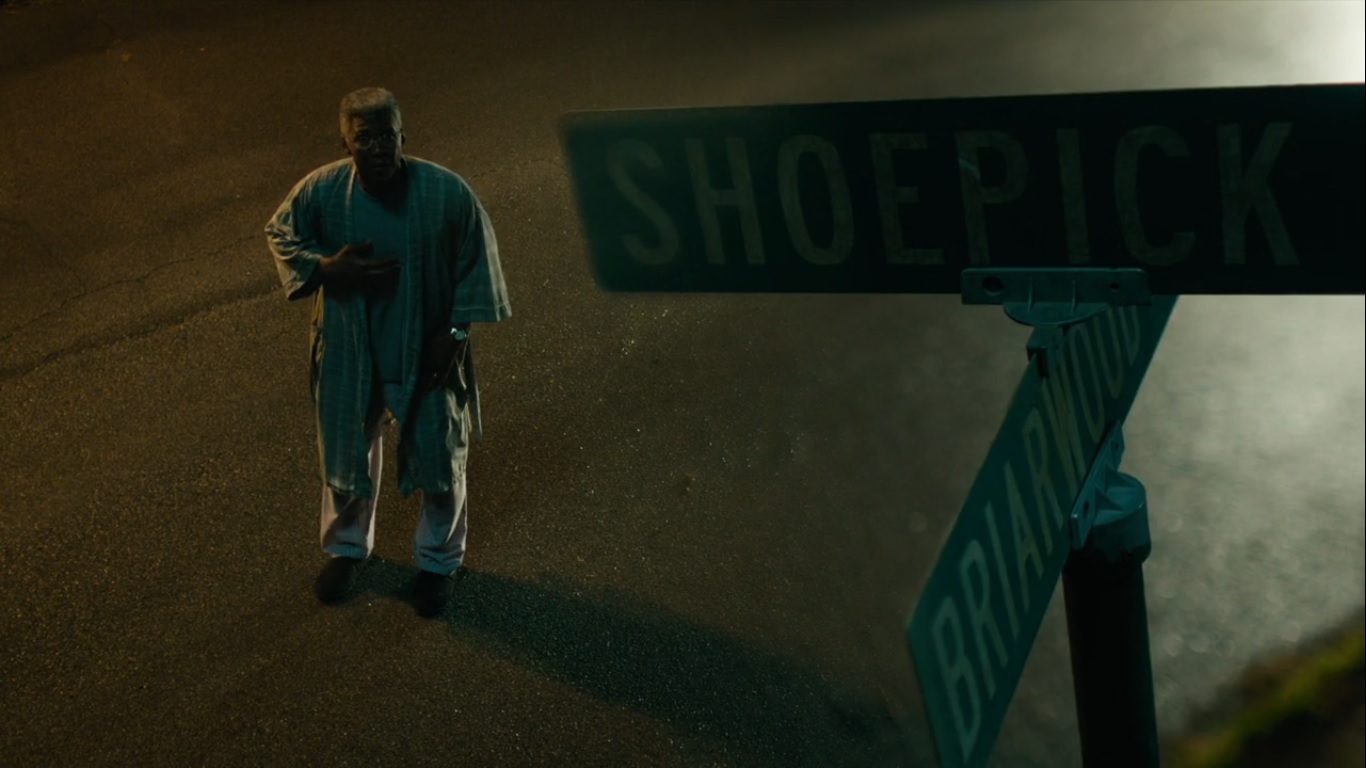 Later, still in 2015, Wayne suddenly finds himself at the intersection of Shoepick and Briarwood. He eyes the remains of a burned out building as the episode comes to a close.