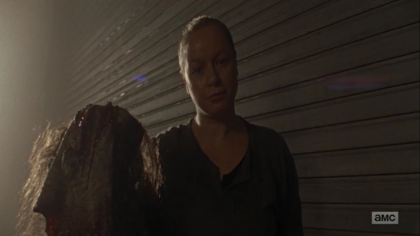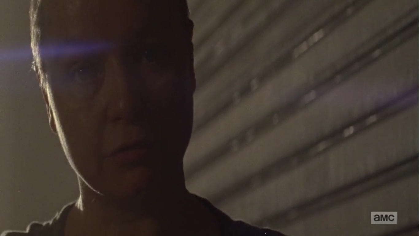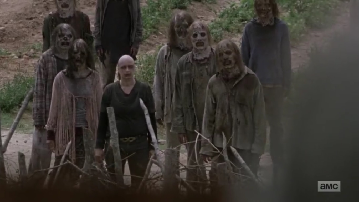 That’s nice. New problem, though. Walkers start literally walking up to the Hilltop. The leader, a bald headed woman, heads to the front and stares down the survivors- it’s Lydia’s mother from the flashbacks. She introduces herself as Alpha, played by Samantha Morton, and explains that she just wants one thing: her daughter.