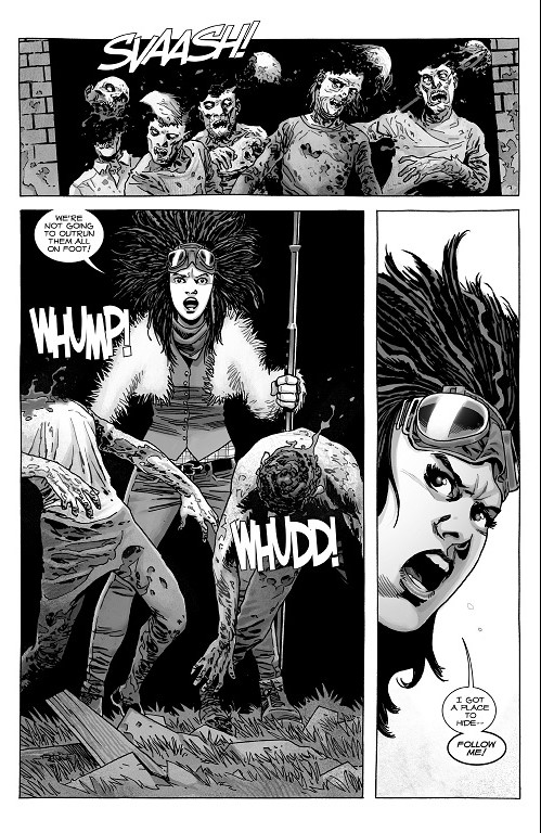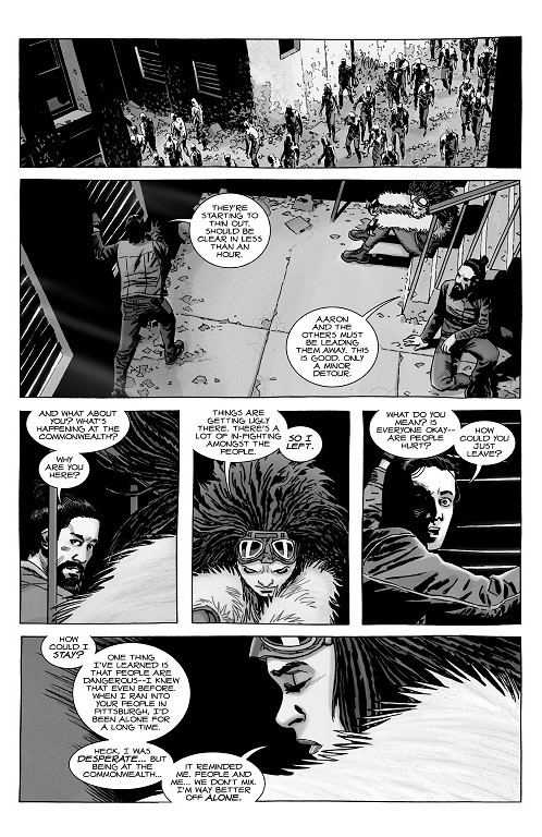 Ultimately, though, Princess does come out of hiding, all while hacking down some roamers in some very good artwork from Charlie Adlard. She motions for the others to follow her, but obviously they can’t all go. They won’t get rid of the roamers that way. So Jesus and Carl head to Princess’ hiding spot while Aaron, Siddiq, and Dante continue to lead the roamers away from their location.
